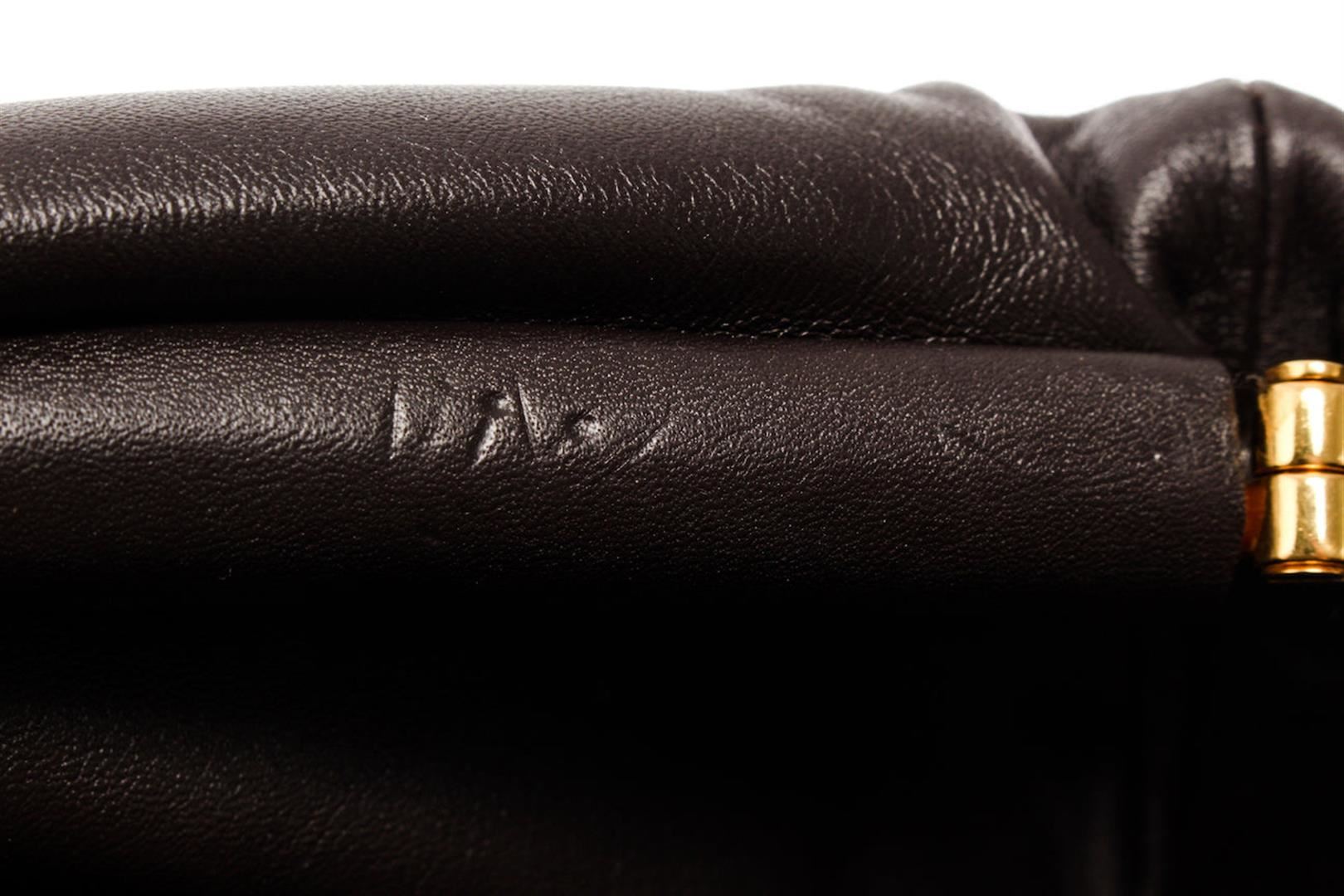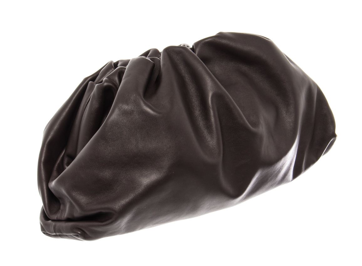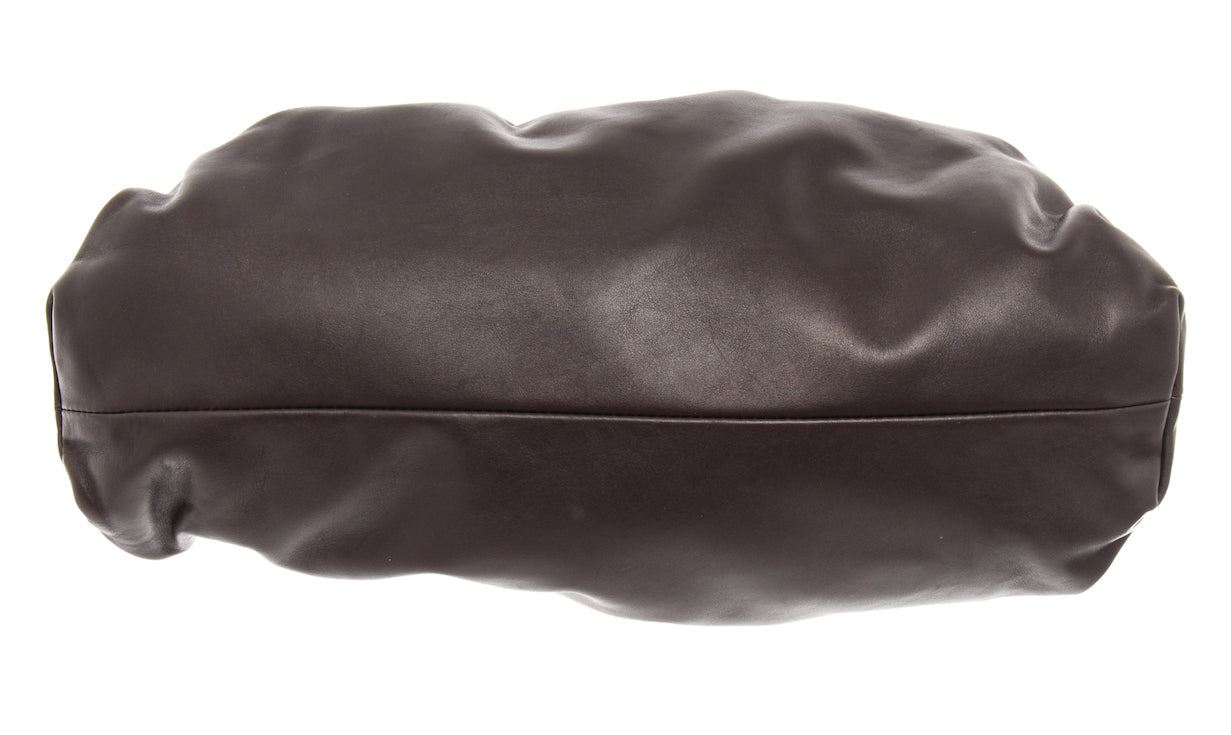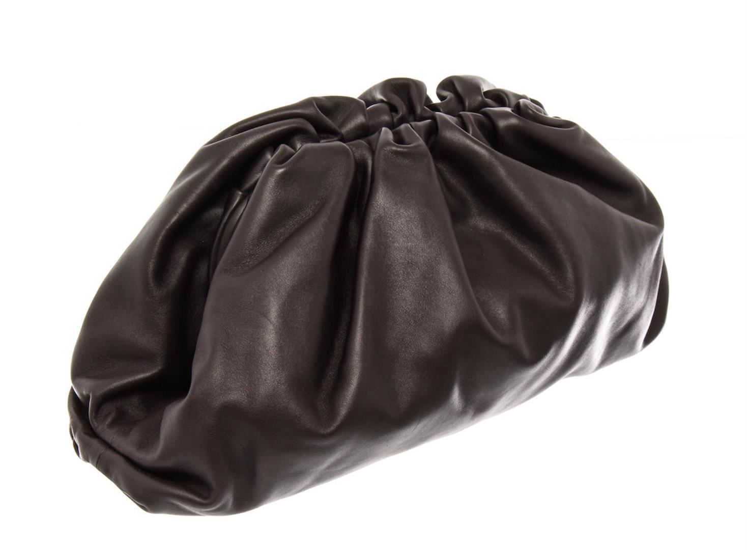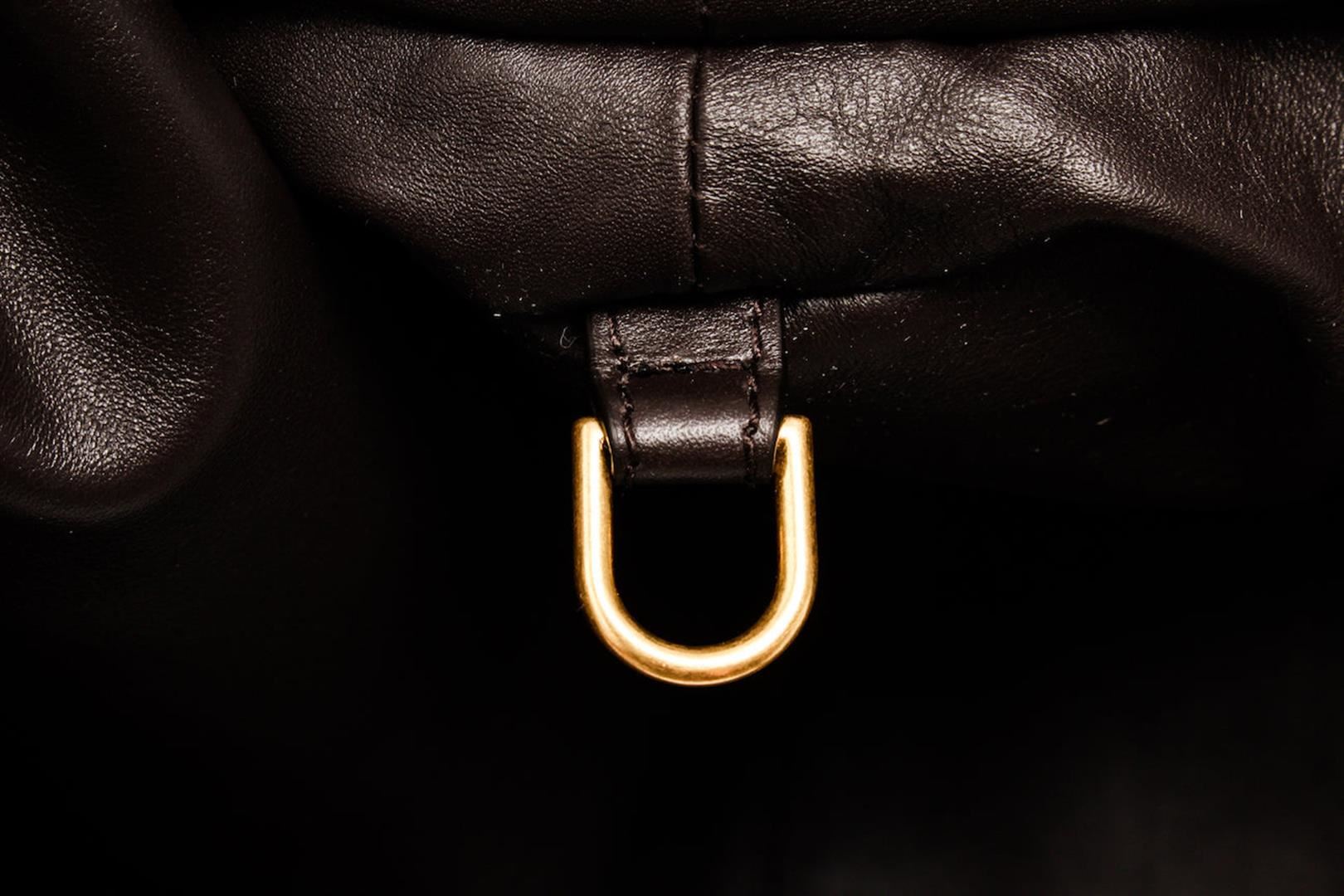 One Bottega Veneta Dark Brown Leather The Pouch Clutch Bag. Item is sold AS-IS. Please check photos and descriptions for all available details. Dark brown leather Bottega Veneta The Pouch clutch bag with gold-tone hardware, ruched detailing, magnetic fastening at top, slouch exterior body and dark brown leather lining. Depth 15 cm, Height 18 cm, Width 38 cm