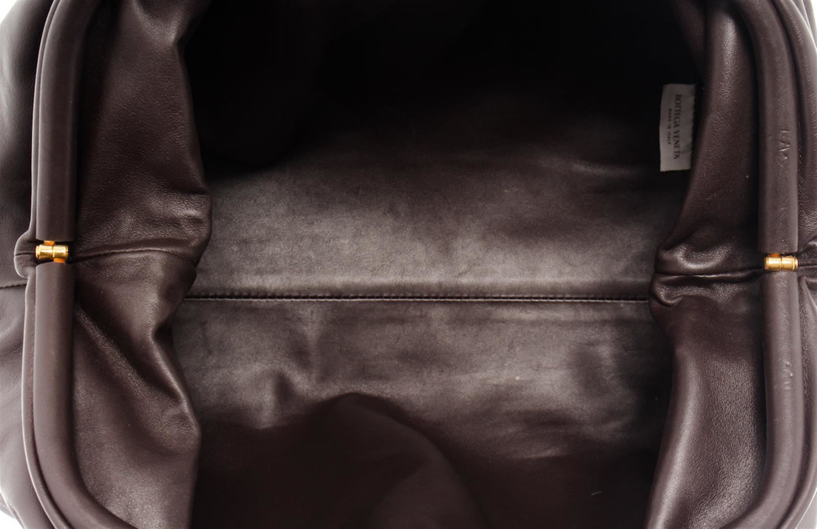 Bottega Veneta Dark Brown Leather The Pouch Clutch Bag. All available information is listed in the description and shown in the photos. Dark brown leather Bottega Veneta The Pouch clutch bag with gold-tone hardware, ruched detailing, magnetic fastening at top, slouch exterior body and dark brown leather lining. Depth 15 cm, Height 18 cm, Width 38 cm