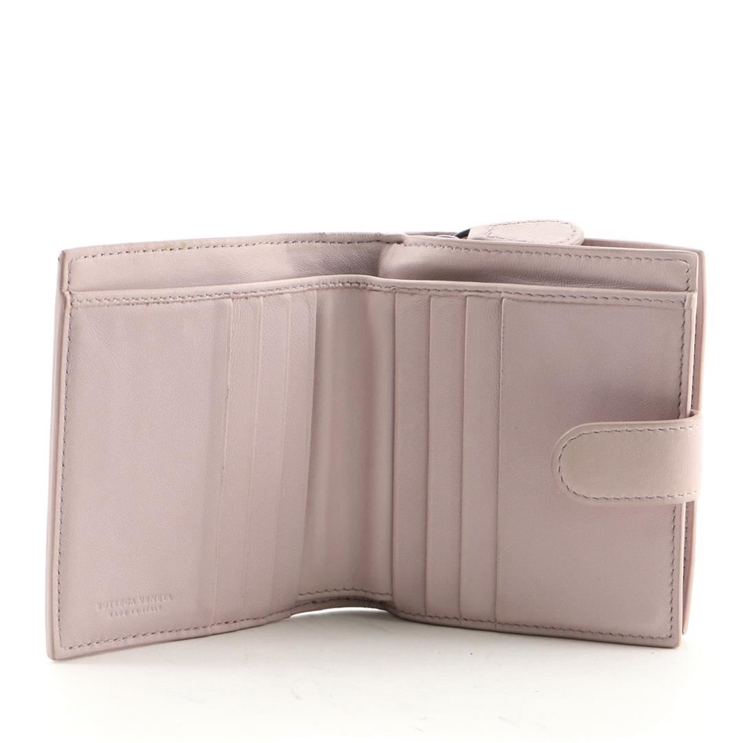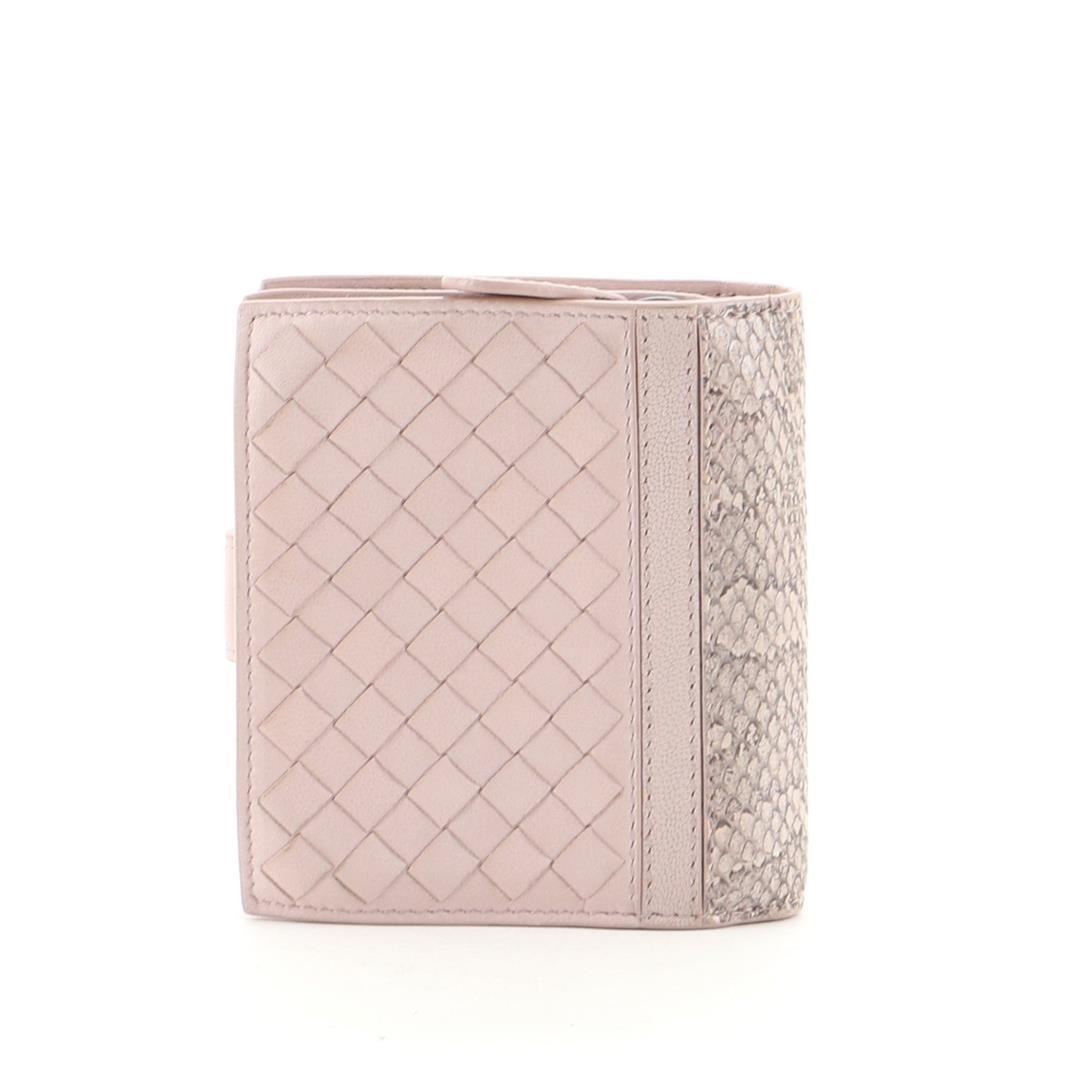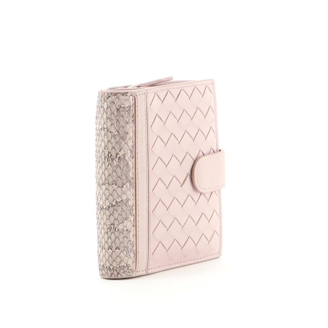 Bottega Veneta French Wallet Intrecciato Nappa with Snakeskin Compact Pink. All available information is listed in the description and shown in the photos. Bottega Veneta French Wallet Intrecciato Nappa with Snakeskin Compact Pink Condition Details: Moderate wear, and darkening on exterior and in interior, lifting of scales on base. Glue stain on interior opening trim, cracking on wax edges, scuffs and wear in interior, scratches and tarnish on hardware. Height 4", Width 4.5", Depth 1", Strap Drop None