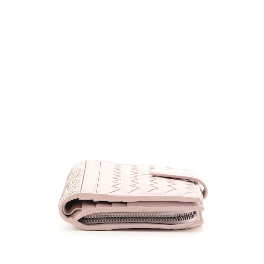 Bottega Veneta French Wallet Intrecciato Nappa with Snakeskin Compact Pink. All available information is listed in the description and shown in the photos. Bottega Veneta French Wallet Intrecciato Nappa with Snakeskin Compact Pink Condition Details: Moderate wear, and darkening on exterior and in interior, lifting of scales on base. Glue stain on interior opening trim, cracking on wax edges, scuffs and wear in interior, scratches and tarnish on hardware. Height 4", Width 4.5", Depth 1", Strap Drop None