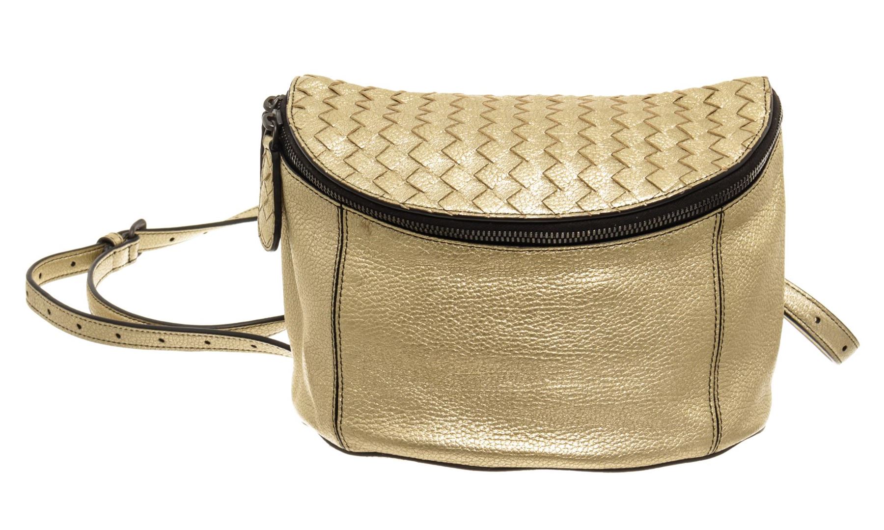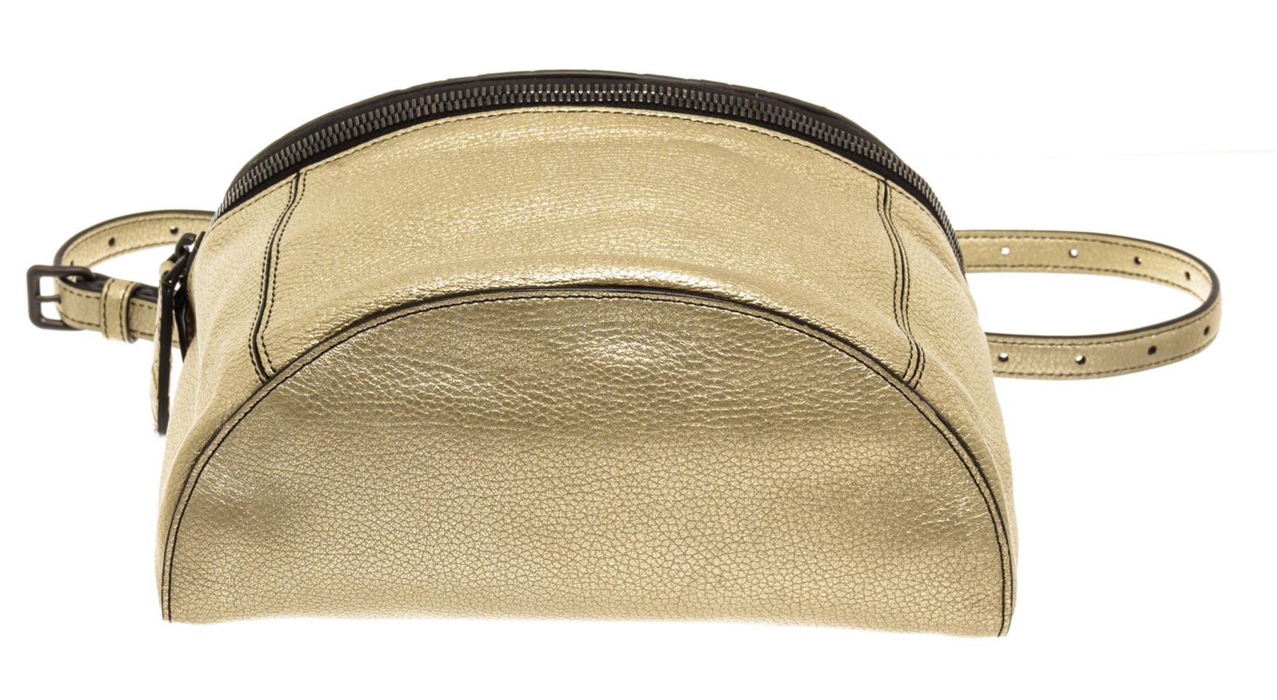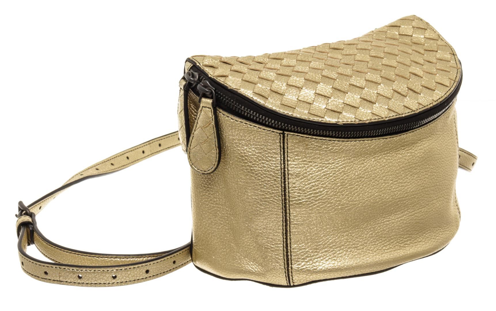 One Bottega Veneta Gold Metallic Top Zip Shoulder Bag. Item is sold AS-IS. All available information is listed in the description and shown in the photo. Bottega Veneta Gold Metallic Top Zip Shoulder Bag with gun metal tone hardware, black leather trim, brown suede lining, and zipper closure.