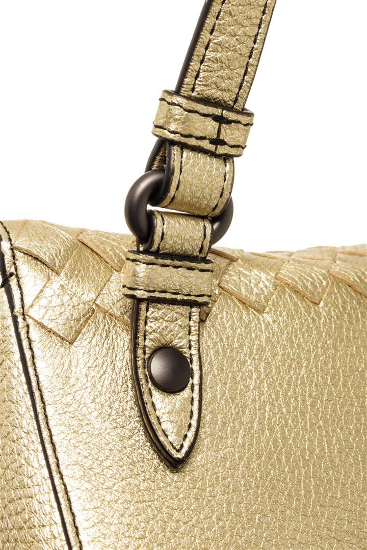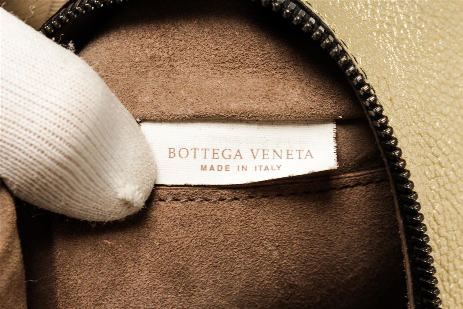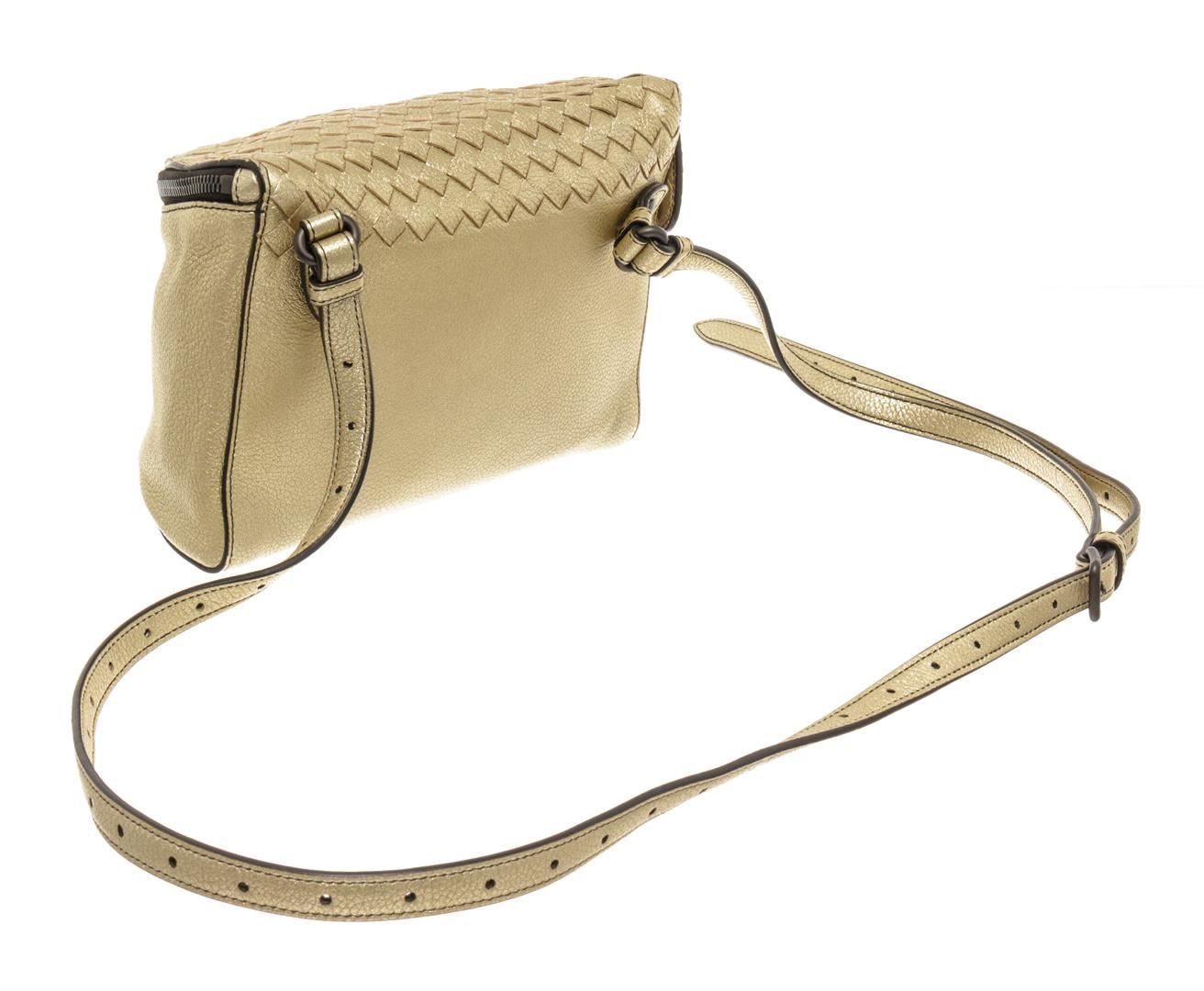 One Bottega Veneta Gold Metallic Top Zip Shoulder Bag. Item is sold AS-IS. All available information is listed in the description and shown in the photo. Bottega Veneta Gold Metallic Top Zip Shoulder Bag with gun metal tone hardware, black leather trim, brown suede lining, and zipper closure.
