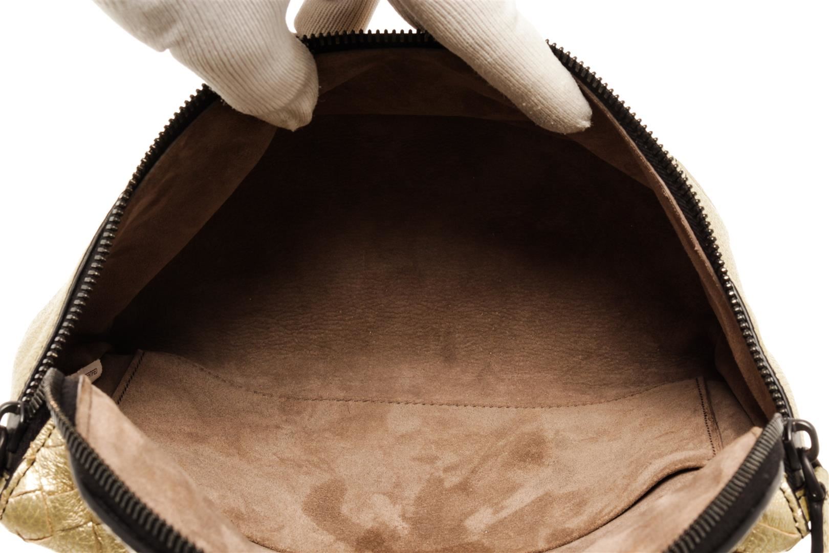 One Bottega Veneta Gold Metallic Top Zip Shoulder Bag. Item is sold AS-IS. All available information is listed in the description and shown in the photo. Bottega Veneta Gold Metallic Top Zip Shoulder Bag with gun metal tone hardware, black leather trim, brown suede lining, and zipper closure.