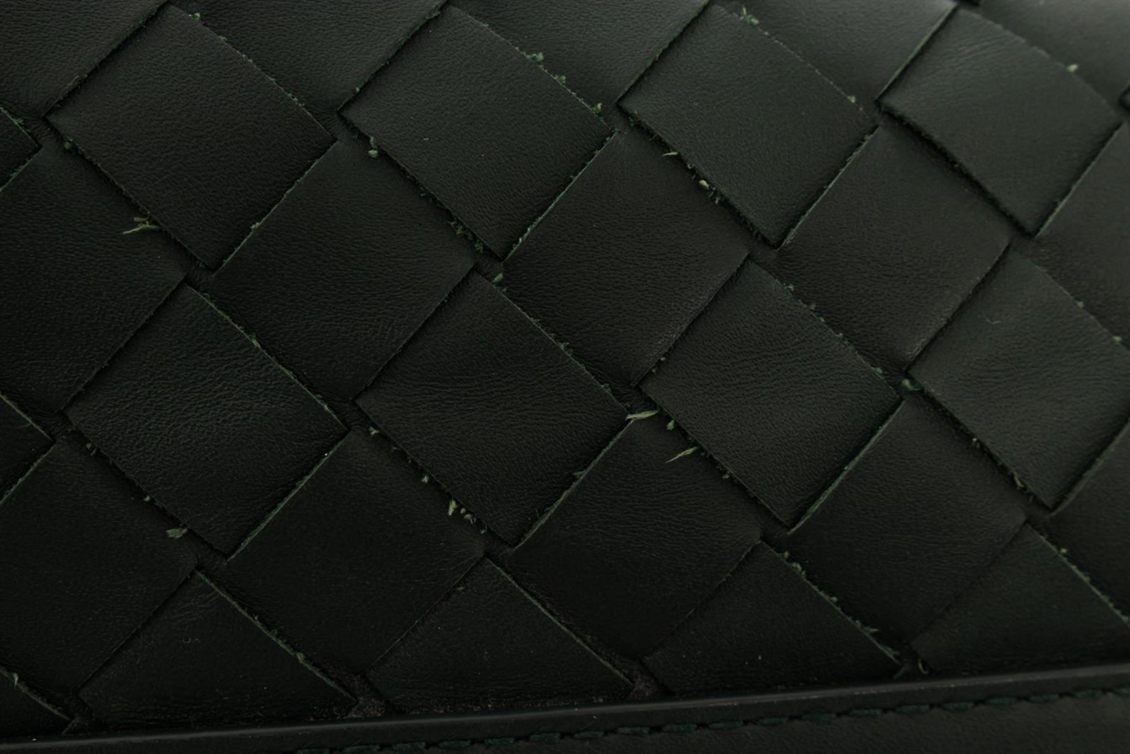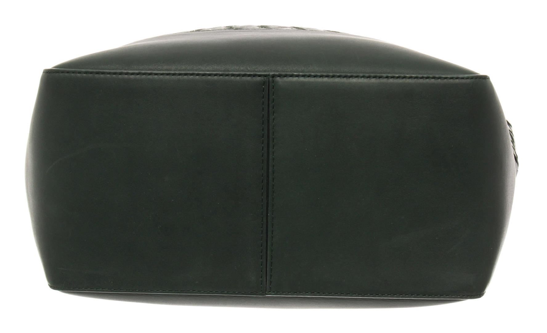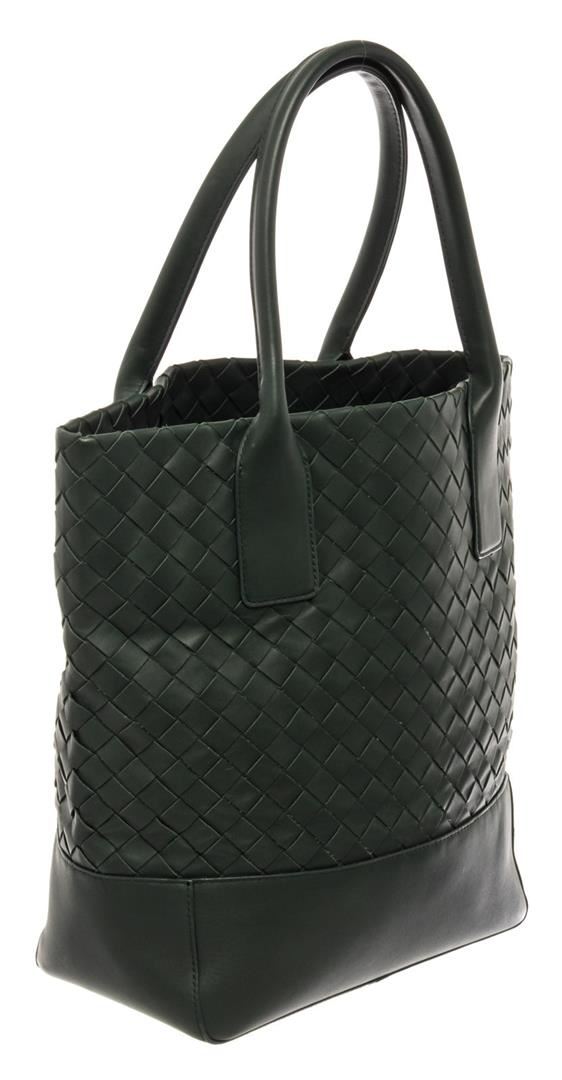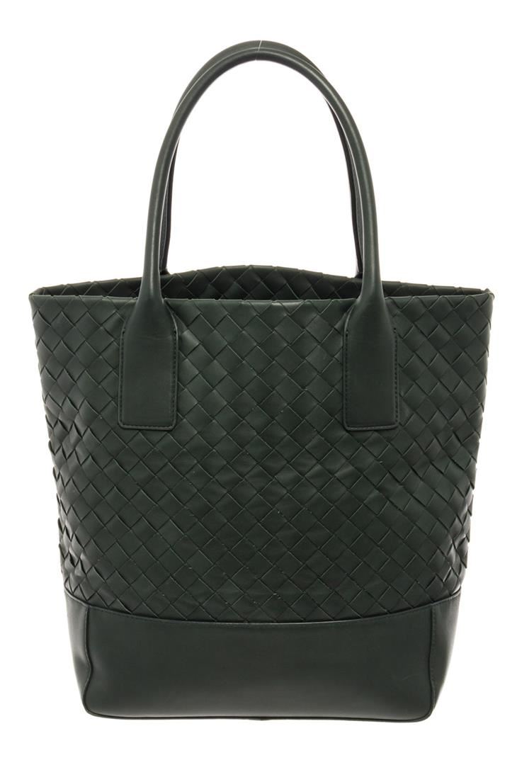 One Bottega Veneta Green Leather Intrecciato Weave Open Tote Bag. Item is sold AS-IS. Please check photos and descriptions for all available details. Dark green-hued leather Bottega Veneta Open tote bag with silver-tone hardware, a signature Intrecciato weave at the exterior body, dual roled top handles, black canvas lining, one zipped pocket inside and an open top.