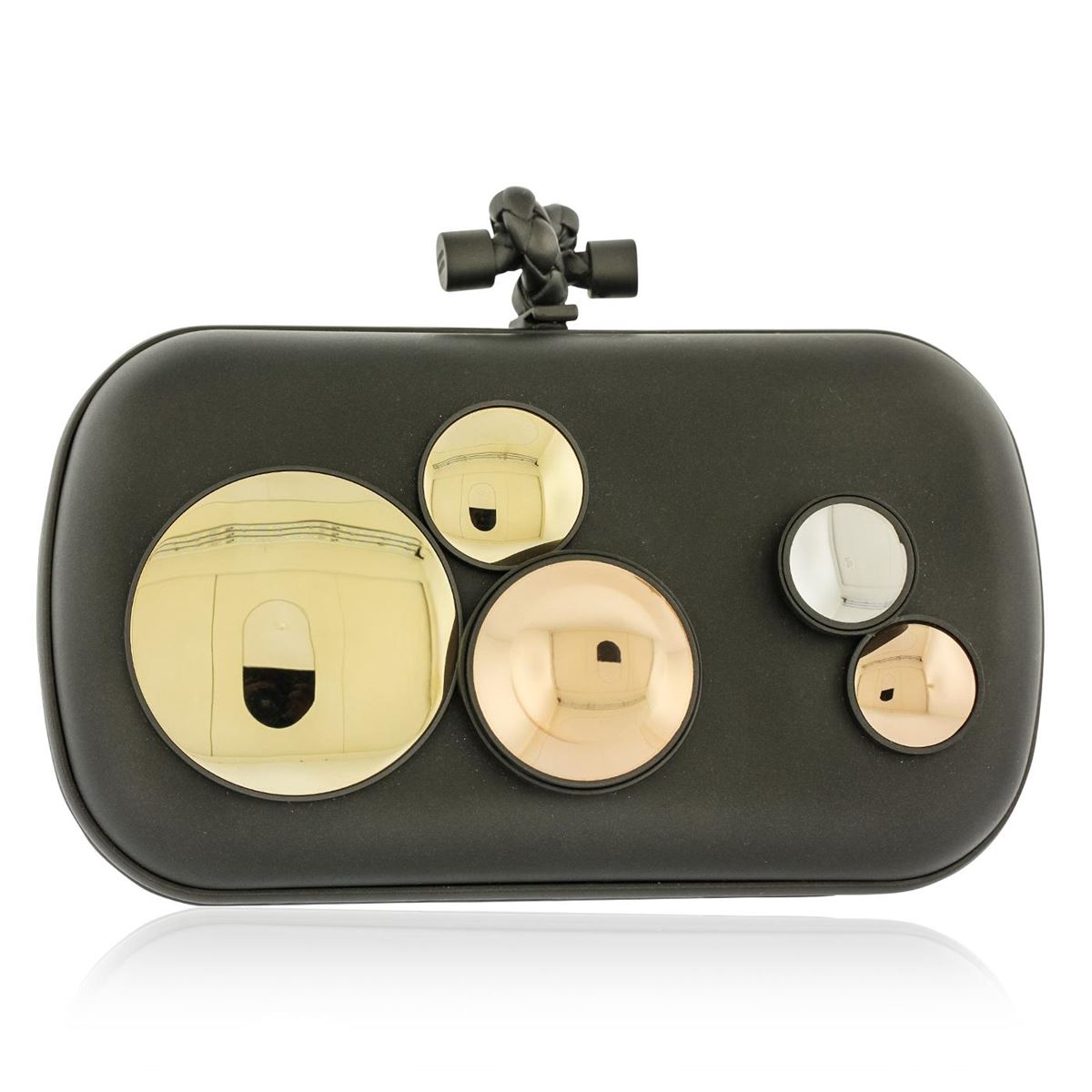 One Bottega Veneta mirror lense clutch featuring: Top clasp closure accented with rope knot and black leather lining. Includes tags and Bottega Veneta dust bag.