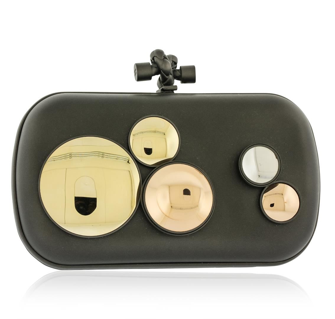 One Bottega Veneta mirror lense clutch featuring: Top clasp closure accented with rope knot and black leather lining. Includes tags and Bottega Veneta dust bag.
