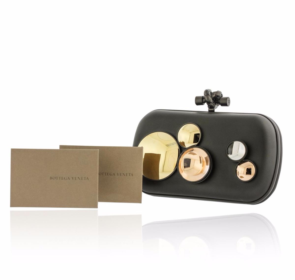 One Bottega Veneta mirror lense clutch featuring: Top clasp closure accented with rope knot and black leather lining. Includes tags and Bottega Veneta dust bag.