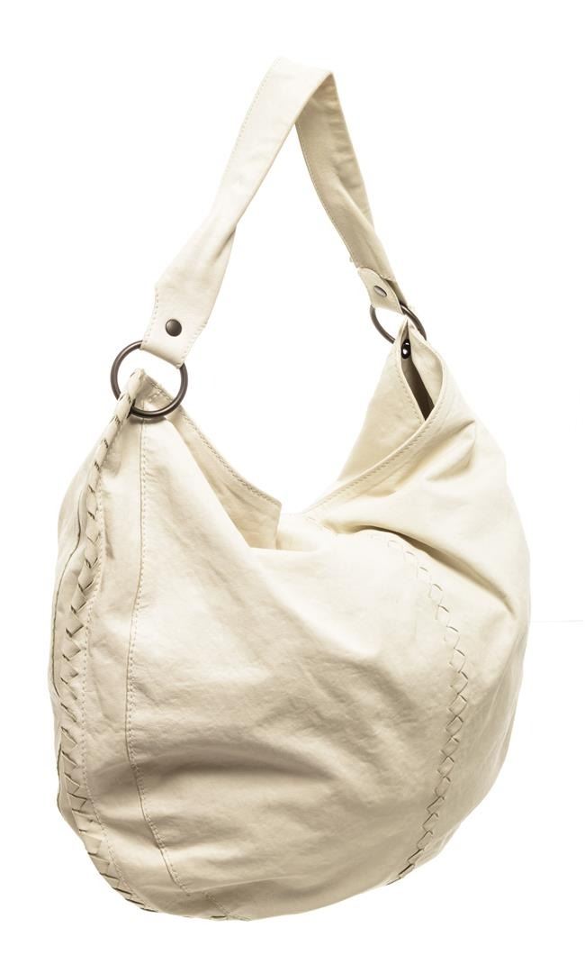 One Bottega Veneta White Leather Hobo Bag. Item is sold AS-IS. All available information is listed in the description and shown in the photo. Bottega Veneta White Leather Hobo Bag features silver-toned hardware, intrecciato weave exterior, brown suede lining, with dual interior pockets, rolled handle and an open top.