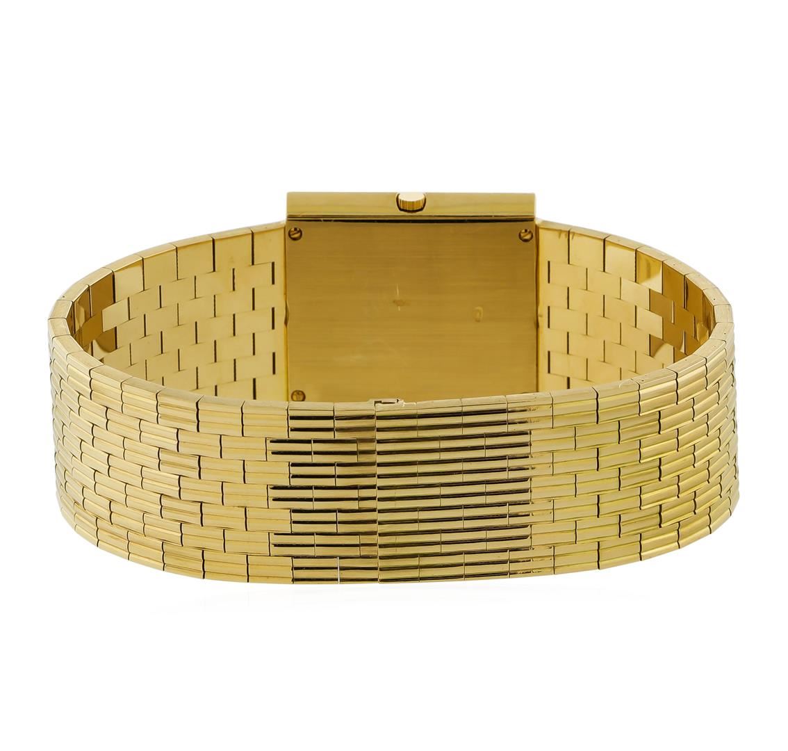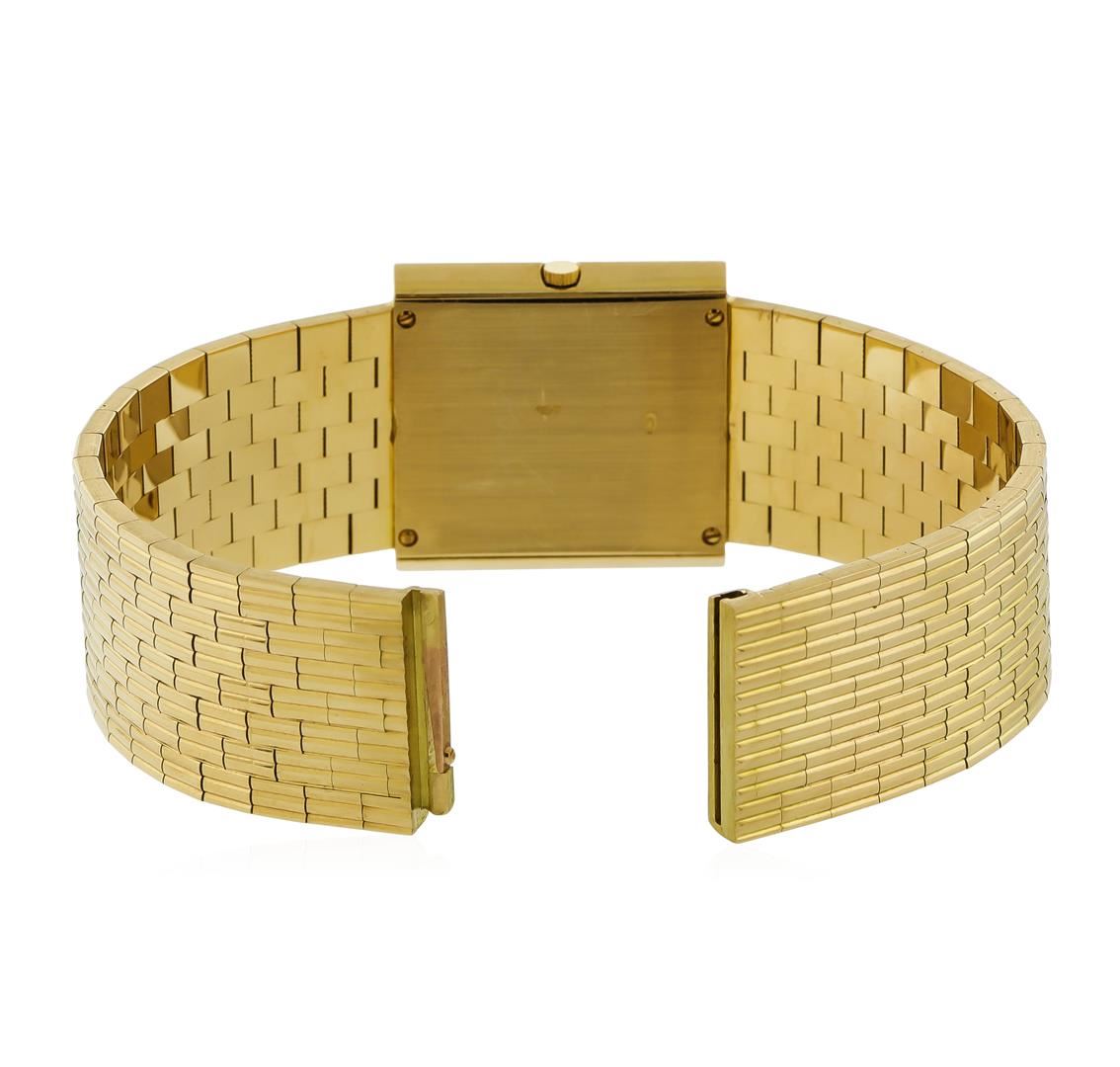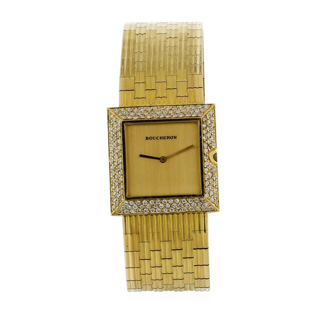 One, Boucheron Classique wristwatch electronically tested 18KT Yellow gold, Case: 26 x 26mm square, Water Resistant: 30 meters / 100 feet, Swiss & France Hallmarked Case Back, engraved with the manufacturers name, and ID numbers, space available for engraving, Crown: scalloped, low profile, Bezel: diamond set, Crystal: synthetic sapphire lens, Movement: quartz. Boucheron signed Dial: Champagne color, & baton narrow pointed hands, Integral Boucheron Bracelet: flexible slightly tapering links, Condition: G-7 near Mint. Seven inch length, adjustable. 18KT Yellow gold concealed clasp. Containing: Approximately One Hundred Sixty-Three prong set round brilliant cut diamonds, measuring 1.20 - 1.10mm (depth est.) approximate total weight of 163 Stones = 1.00ct. Graded in the setting. Clarity: VS-1 to SI-1 Average Color F - H. Total Weight of Diamonds 1.00ct. Total Weight of Watch 95.62gm. AIG Appraised at $15,600.00.