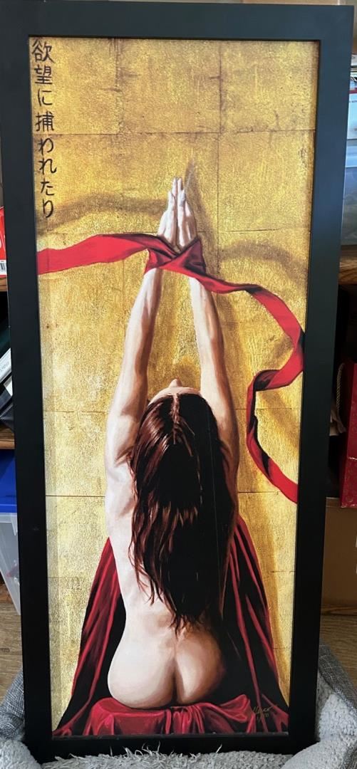 One of Dellorco Desires three-piece Suite. Bound by Desire measures 40.5x15", in a 43x17.75" simplistic black frame.