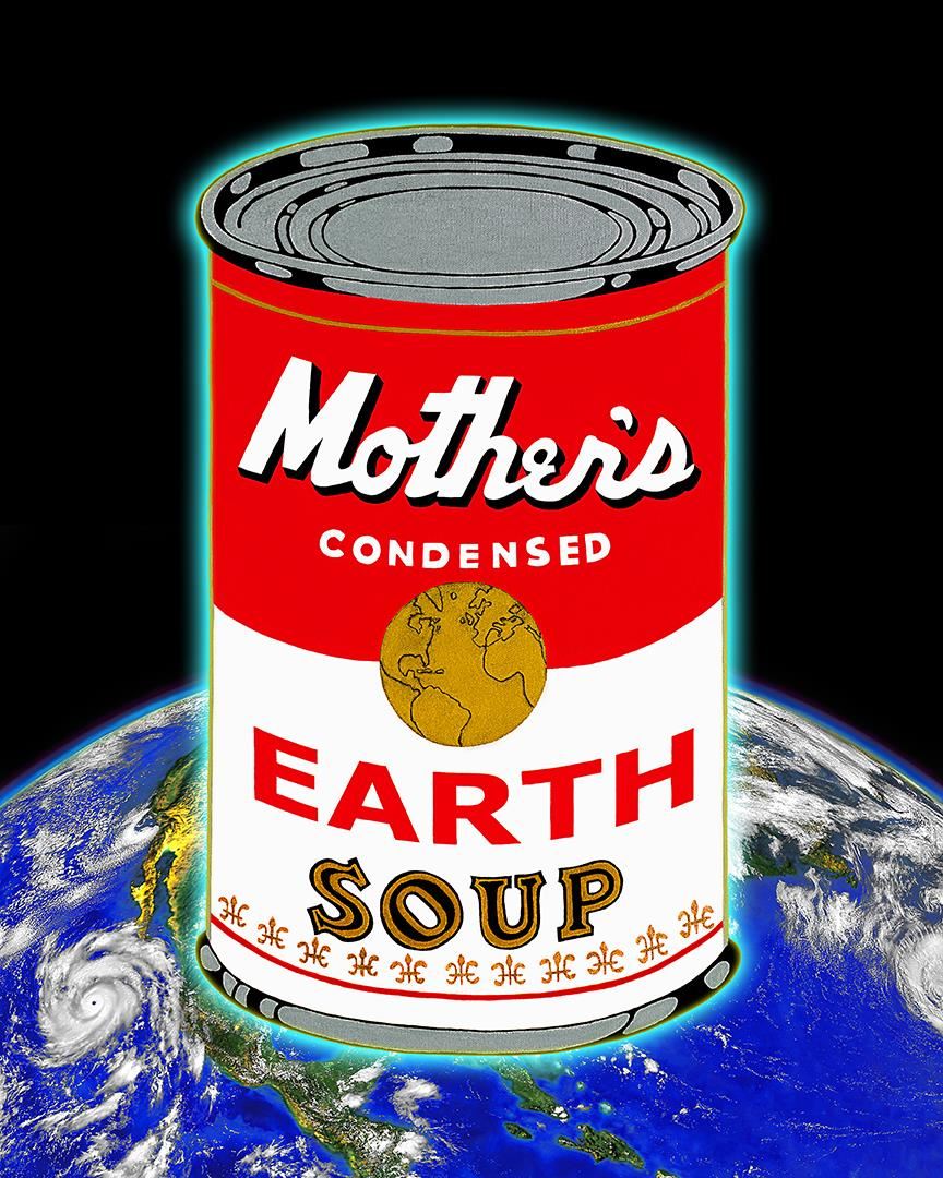 "Mother's Condensed Earth Soup" by Bragg is a 30x24 " uses Andy Warhol's iconic imagery reminding us to respect Mother Nature and to work together to heal our planet .