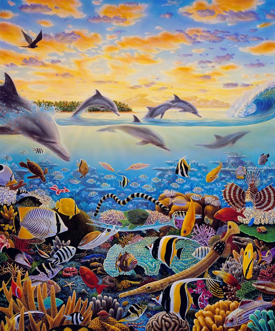 A 36X30" giclee on canvas, "Tales of Tavarua" dynamically displays the artist's enormous talent for capturing form, color and detail in this complex undersea composition of an amazing coral reef in Fiji.