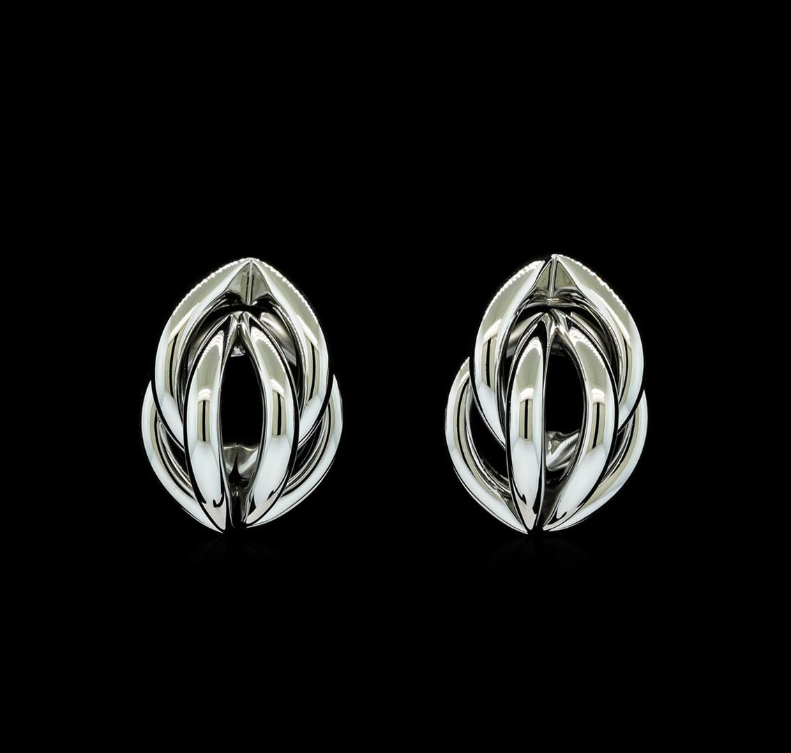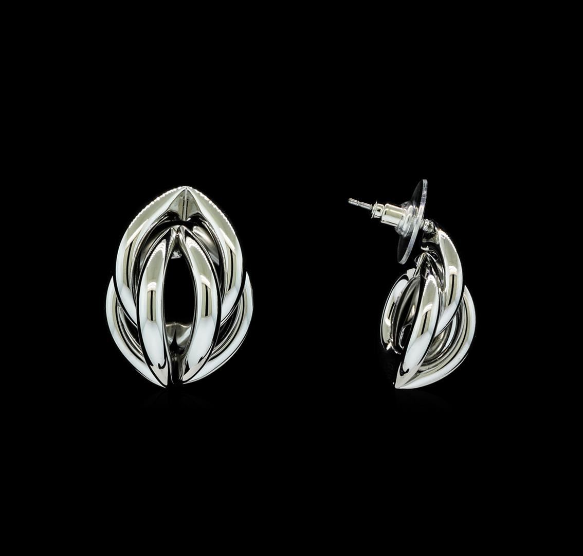 High end designer jewelry. Braided Shell Shaped Post Earrings - Rhodium Plated. Rhodium Plated Stud Set. Silver. 1.25inch.