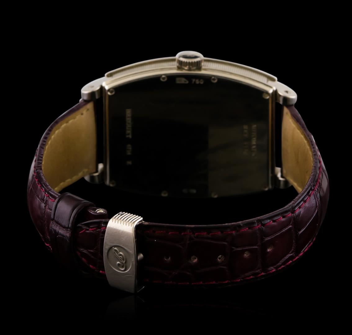 One Breguet Heritage Big Date men's watch featuring: Movement: Automatic self-winding. Case: 18KT white gold. Case Shape: Tonneau. Bezel: 18KT white gold fixed. Crystal: Scratch resistant sapphire. Dial: Silver color; roman numerals; blue breguet style hands. Features: Seconds subdial at 6 o'clock position; double date window located at the 12 o'clock position. Bracelet: Brown leather strap with 18KT white gold deployment buckle. Condition: Case/bezel have minor surface scratches, but otherwise in good condition.
