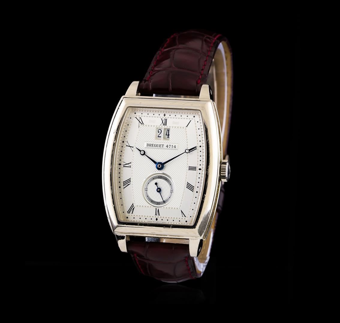 One Breguet Heritage Big Date men's watch featuring: Movement: Automatic self-winding. Case: 18KT white gold. Case Shape: Tonneau. Bezel: 18KT white gold fixed. Crystal: Scratch resistant sapphire. Dial: Silver color; roman numerals; blue breguet style hands. Features: Seconds subdial at 6 o'clock position; double date window located at the 12 o'clock position. Bracelet: Brown leather strap with 18KT white gold deployment buckle. Condition: Case/bezel have minor surface scratches, but otherwise in good condition.