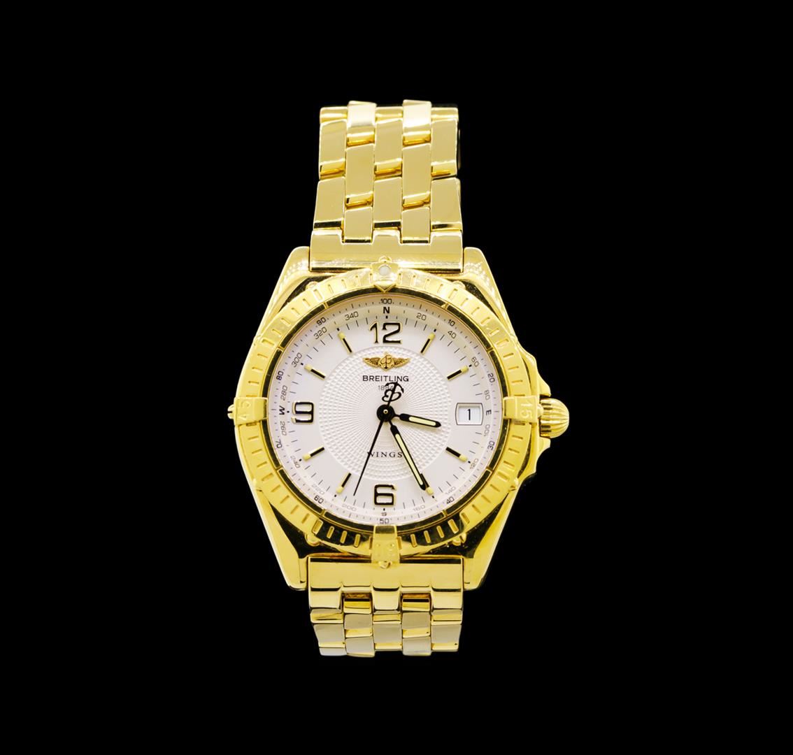 One gents, hand crafted & machine milled Breitling 18KT yellow gold Wings, wristwatch electronically tested, Case: 38mm, Case Back: engraved with the manufactures logo in high relief, information, and ID numbers, Water Resistant: 100 meters/ 330 feet, Crown: scalloped, set within protective shoulders, Bezel: uni-directional, engraved with indices and set four 18KT yellow gold raised stations, Crystal: synthetic sapphire. Case Ring: slide rule and compass functions, Movement: Breitling automatic with an estimated 40 hour power reserve, Breitling signed Dial: Cream color, with luminous hands, indices and numerals, Calendar: 3 o'clock position date window, Condition: G-7 near mint. Breitling Wings Bracelet 18KT yellow gold, with a concealed deployment flip lock clasp. Total Weight of Watch 209.97gm. AIG Appraised at $20,100.00.