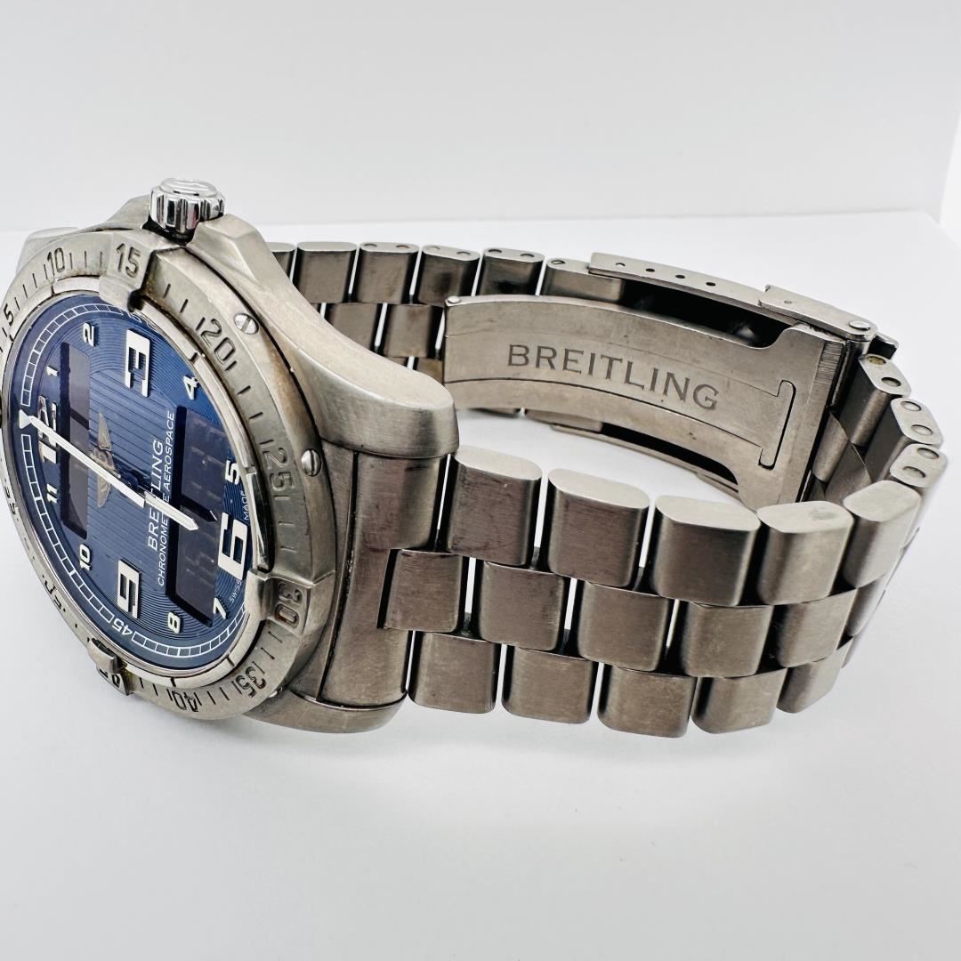 This Breitling Aerospace is a multifunction chronometer crafted in lightweight titanium, offering both durability and comfort. The blue dial features analog hands and dual digital displays for multiple time zones, chronograph, alarm, and countdown functions. With its professional-grade precision and aviation-inspired design, this timepiece is a versatile tool watch favored by pilots and collectors alike.