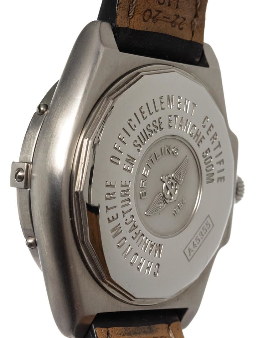 Breitling Black Leather Chronomet Watch with leather, silver-tone hardware.