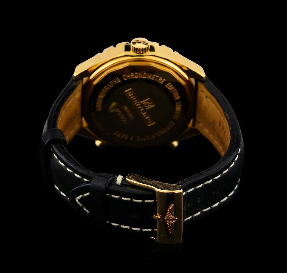 One Breitling Chrono-Matic men's watch featuring: Case: 18KT rose gold, round, 45mm diameter. Dial: black with Arabic numerals. Movement: Automatic. Bezel: 18KT rose gold. Crystal: Sapphire. Bracelet: Black leather with 18KT rose gold buckle. Condition: minor wear on bracelet and back of case, but otherwise in near perfect condition.