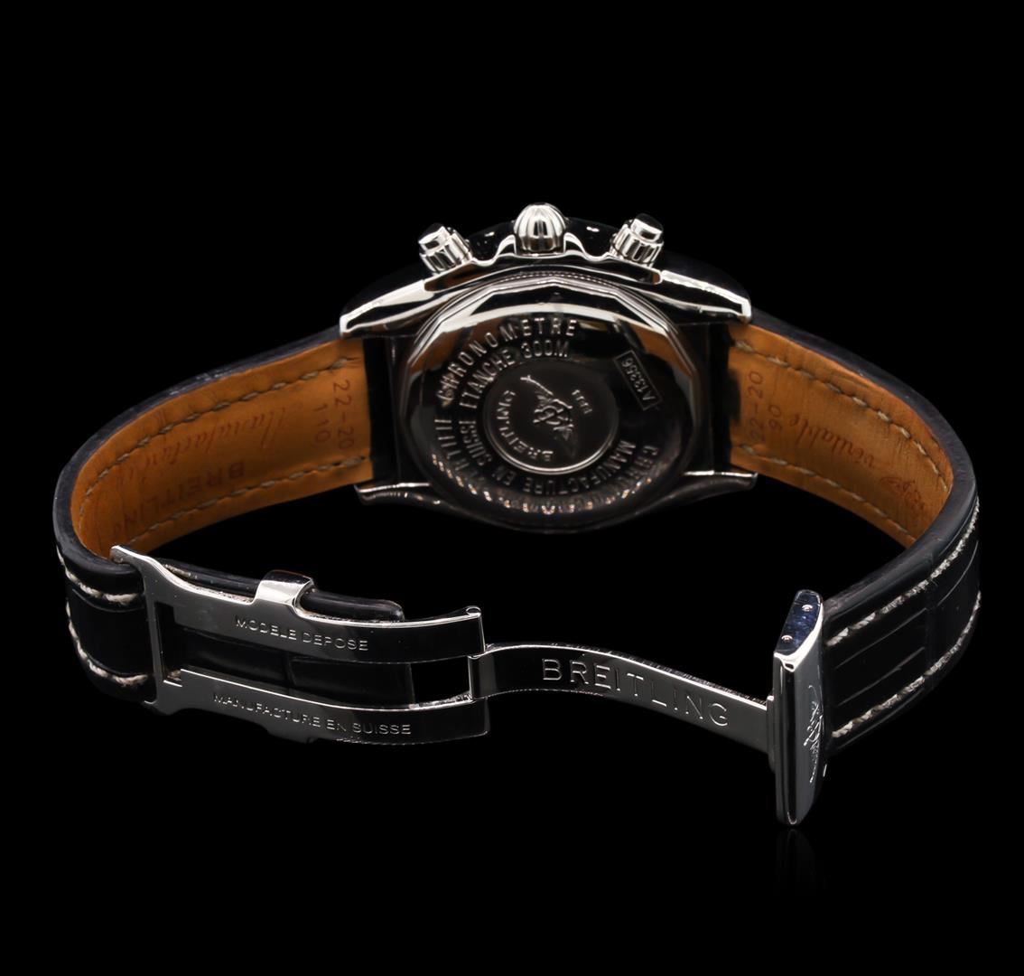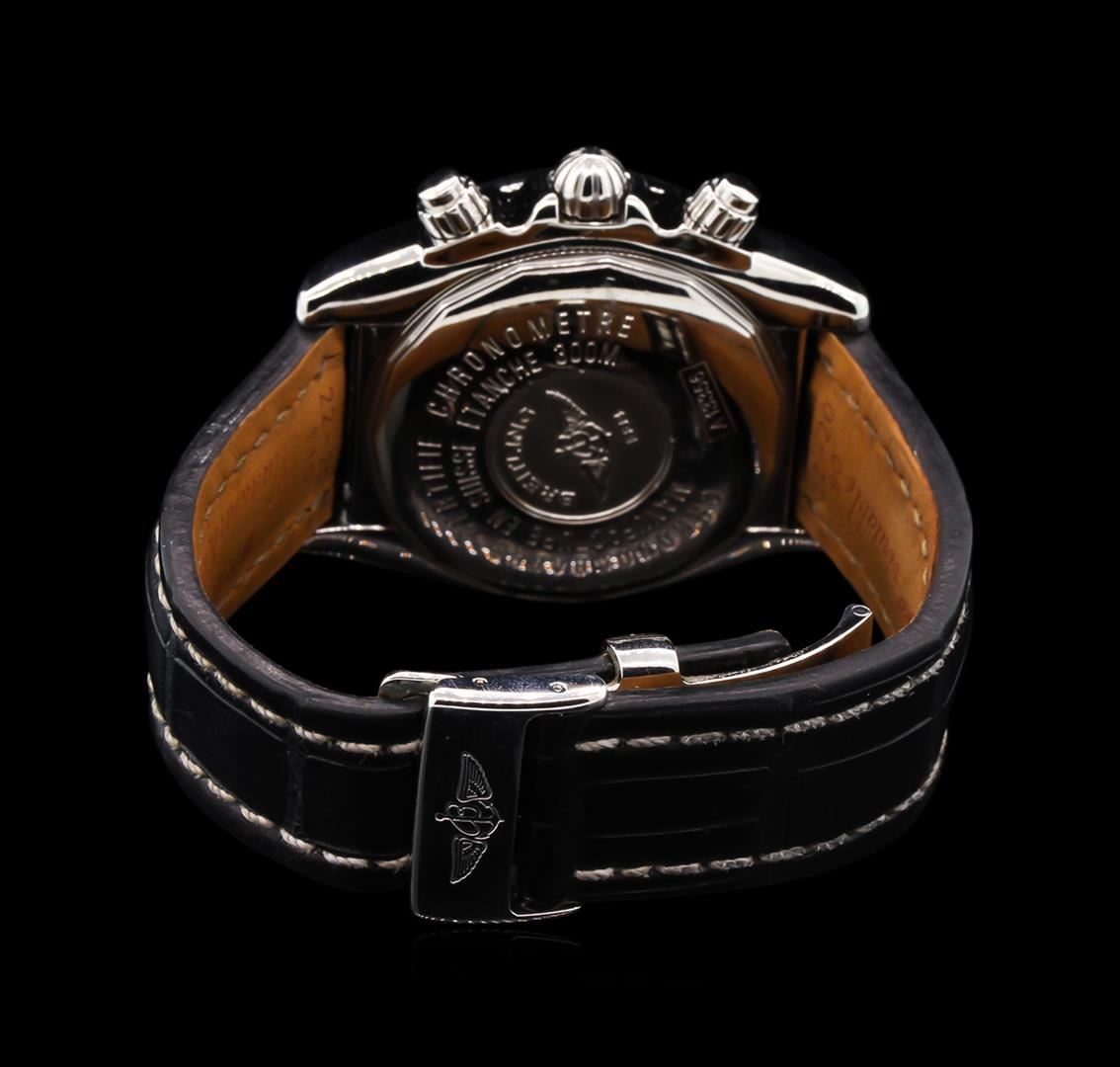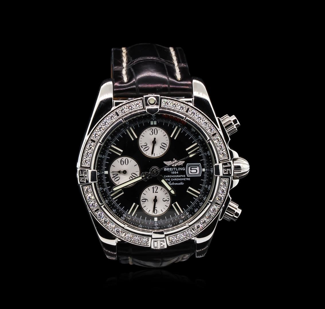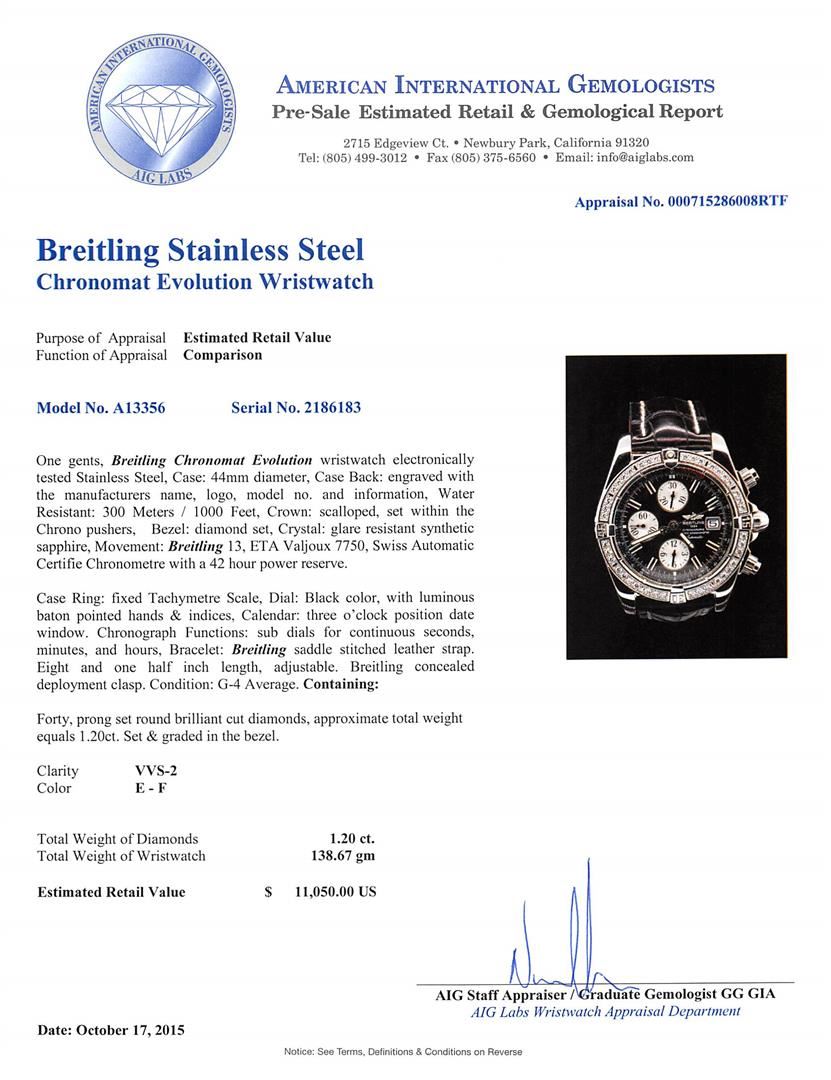 One gents, Breitling Chronomat Evolution wristwatch electronically tested Stainless Steel, Case: 44mm diameter, Case Back: engraved with the manufacturers name, logo, model no. and information, Water Resistant: 300 Meters / 1000 Feet, Crown: scalloped, set within the Chrono pushers, Bezel: diamond set, Crystal: glare resistant synthetic sapphire, Movement: Breitling 13, ETA Valjoux 7750, Swiss Automatic Certified Chronometre with a 42 hour power reserve. Case Ring: fixed Tachymetre Scale, Dial: Black color, with luminous baton pointed hands & indices, Calendar: three o'clock position date window. Chronograph Functions: sub dials for continuous seconds, minutes, and hours, Bracelet: Breitling saddle stitched leather strap. Eight and one half inch length, adjustable. Breitling concealed deployment clasp. Condition: G-4 Average. Containing: Forty, prong set round brilliant cut diamonds, approximate total weight equals 1.20ct. Set & graded in the bezel. Clarity: VVS-2. Color: E - F. Total Weight of Diamonds 1.20ct. Total Weight of Wristwatch 138.67gm. AIG Appraised at $11,050.00.