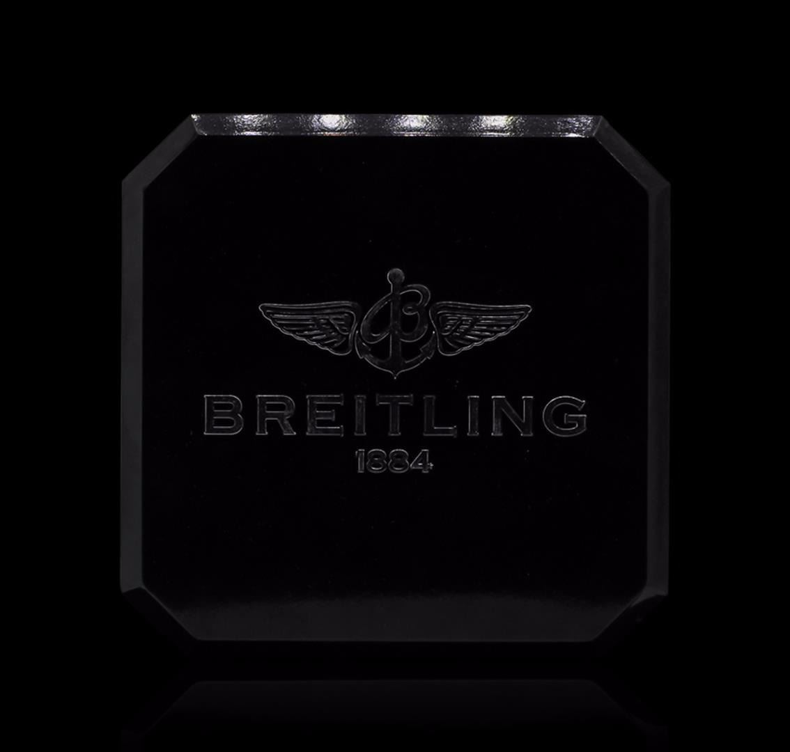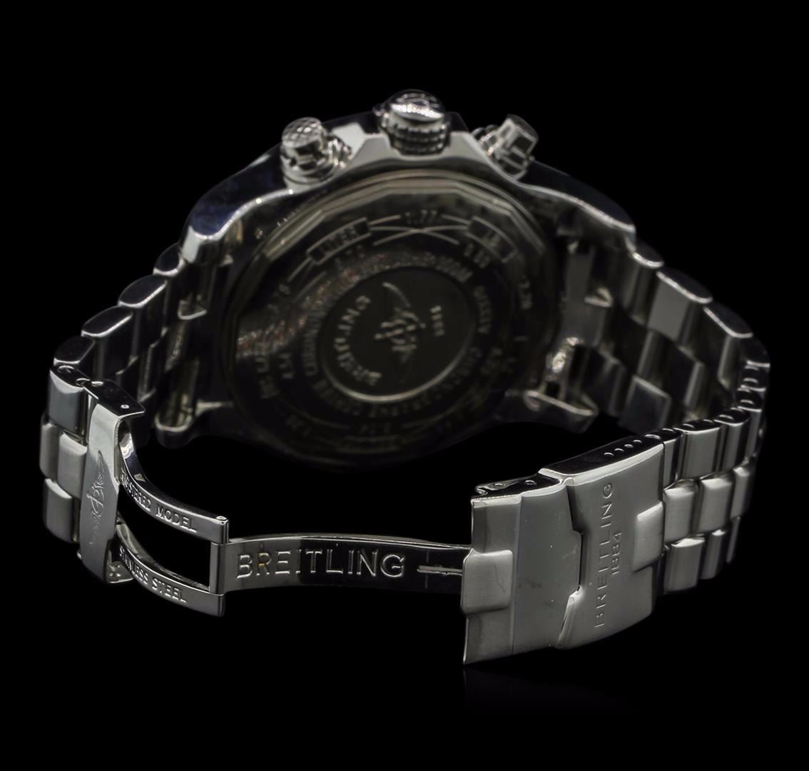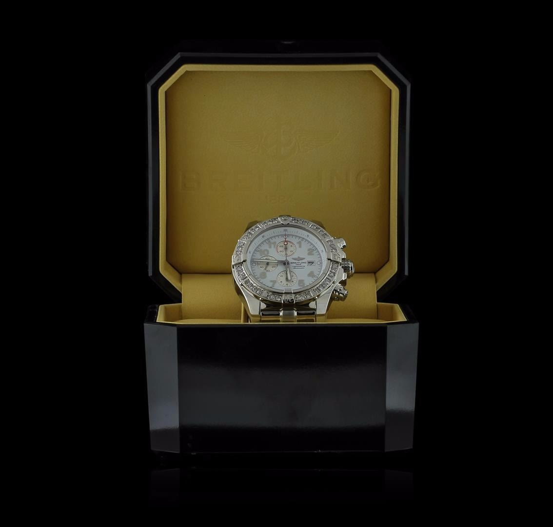One gents, Breitling Chronograph wristwatch Aeromarine Super Avenger electronically tested Stainless Steel, Case: 49mm diameter, Case Back: engraved with Breitling logo, information, and ID numbers, Water Resistant: 300 meters / 1000 feet, Customized Uni-directional Bezel: diamond set, Logo'd Crown: twin lock, set within protective shoulders, Crystal: synthetic sapphire, Movement: Breitling 13, ETA Valjoux 7750, Automatic Certified Chronometre. Dial: White, with luminous baton pointed hands & raised numerals, three o'clock position date display window, Chronograph Functions: continuous seconds sub dial at 9 o'clock, 30 minute totalizer at 12 o'clock, 12 hour totalizer at 6 o'clock, with stainless steel pushers. Power Reserve: 42 Hours, Bracelet: Stainless Steel Professional II, eight and one half inch length, with the flip lock clasp. Condition: G-6 Extra. Bright polish finish. Containing: Forty prong set round brilliant cut diamonds, approximate total weight equals 1.80ctw. Set & graded in the bezel. Clarity: SI-2 to I-1. Color: H - I. Total Weight of Diamonds 1.80ct. Total Weight of Wristwatch 245.81gm. AIG Appraised at $9,050.00.