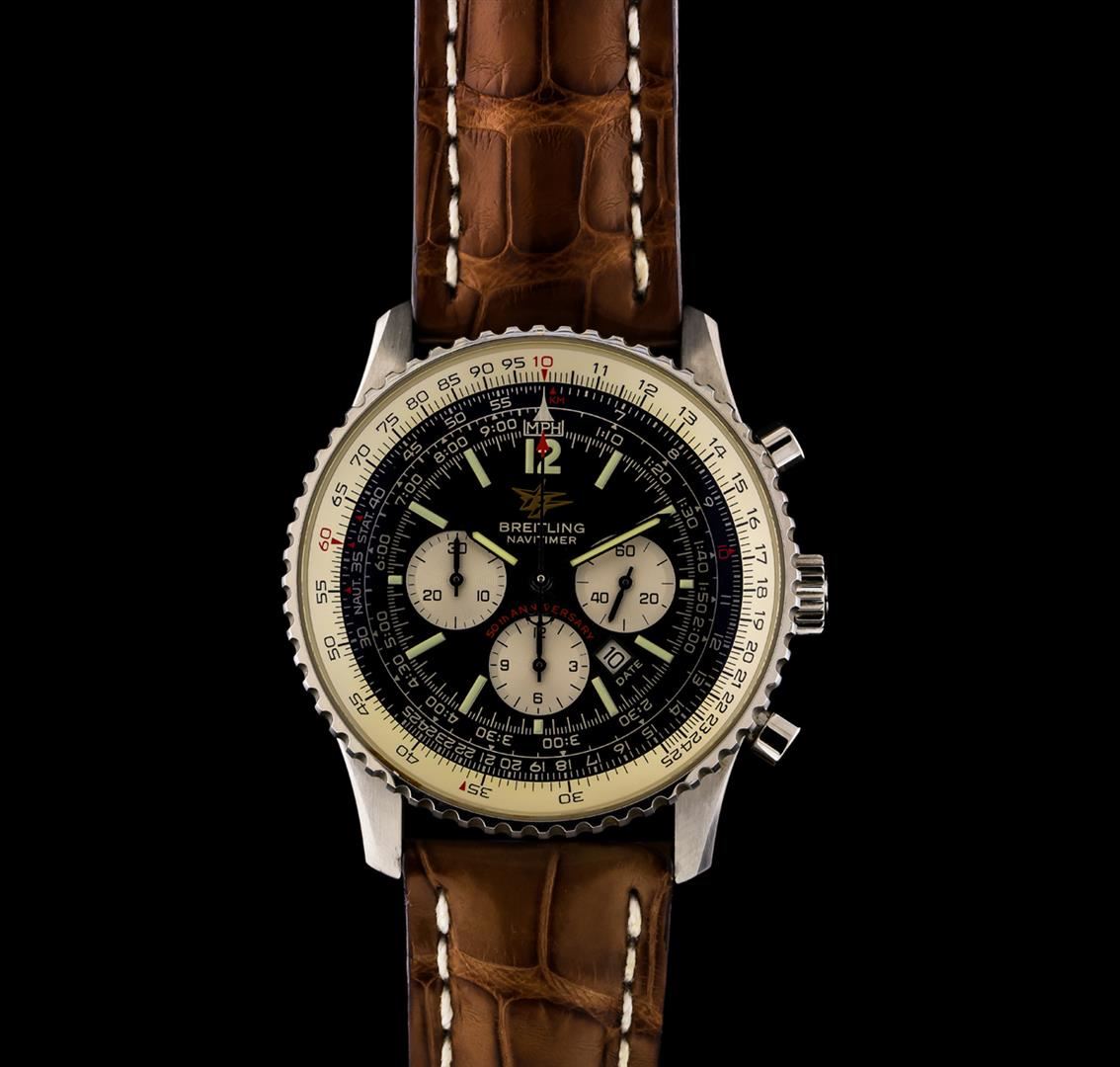 One, Breitling Navitimer 50th Anniversary Chronograph wristwatch electronically tested Stainless Steel, Case: 40mm diameter, Case Back: engraved with the manufacturers anniversary and other information & ID numbers, Bezel: bi-directional, Crown: locking with logo, set between the Chrono pushers. Circa: 2002Slide Rule Functions: accurate computations involving multiplication and division in terms of time, distance, fuel consumption and other normal flight and navigation computations dealing with speed, time and distance. Tachometer Functions: Enables you to determine average speeds or hourly productivity rate, based on an observation period of less than 60 seconds. Crystal: glare proof synthetic sapphire, Movement: Breitling 41, Automatic, ETA 2892-A2, with a 42 hour power reserve, Chronograph Functions: sub dials for; Hours, Minutes, and continuous Seconds, Breitling signed Dial: Black, with luminous pointed hands, indices, the original emblem of the era consisting of two stylized planes, and a continuation of the slide rule functions, 4 o'clock position date window. Breitling Bracelet: saddle stitched leather strap, Eight inch length, adjustable. Breitling buckle. Condition: G-6 Extra Fine. Total Weight of Wristwatch 104.26gm. AIG Appraised at $10,000.00.