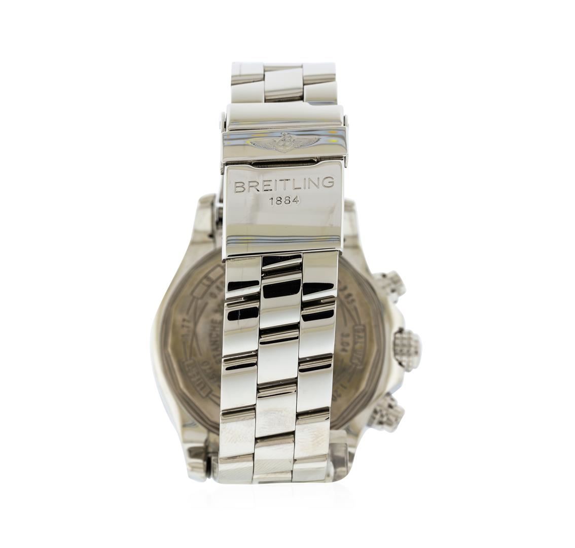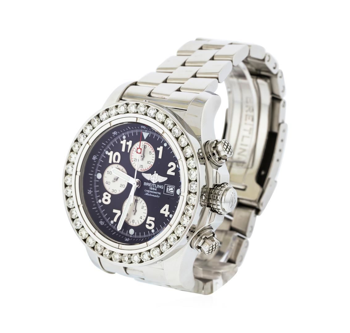 One gents, Breitling Super Avenger wristwatch electronically tested Stainless Steel, Case: 49mm diameter, Case Back: engraved with the manufacturers name and logo in high relief, also engraved with additional information, and ID numbers, Water Resistant: 300 Meters / 1000 Feet. Crown: scalloped; Breitling logo engraved in high relief, set within protective shoulders and the chronograph pushers, Custom Fixed Bezel: diamond set, Crystal: glare resistant synthetic sapphire, Movement: Breitling 13, ETA Valjoux 7750, Swiss Automatic Certifie Chronometre with a 42 hour power reserve. Case Ring: Stopwatch scale, Breitling signed Dial: Black color, with luminous baton pointed hands & indices, Date Window: three o'clock position, Chronograph Functions: three sub dials for; continuous seconds, 30 minutes, & 12 hour totalizers. Breitling Bracelet: Stainless Steel Professional II links; eight and one half inch length, adjustable. Condition: G-6 Extra Fine. Bright polish finish. Containing: Forty burnish set round brilliant cut diamonds, measuring 3.50 - 3.30mm (depth est.) approximate total weight = 6.00ct. Clarity VVS-2 to VS-1 Average Color H - J. Total Weight of Diamonds 6.00ct. Total Weight of Wristwatch 259.22gm. AIG Appraised at $23,000.00.