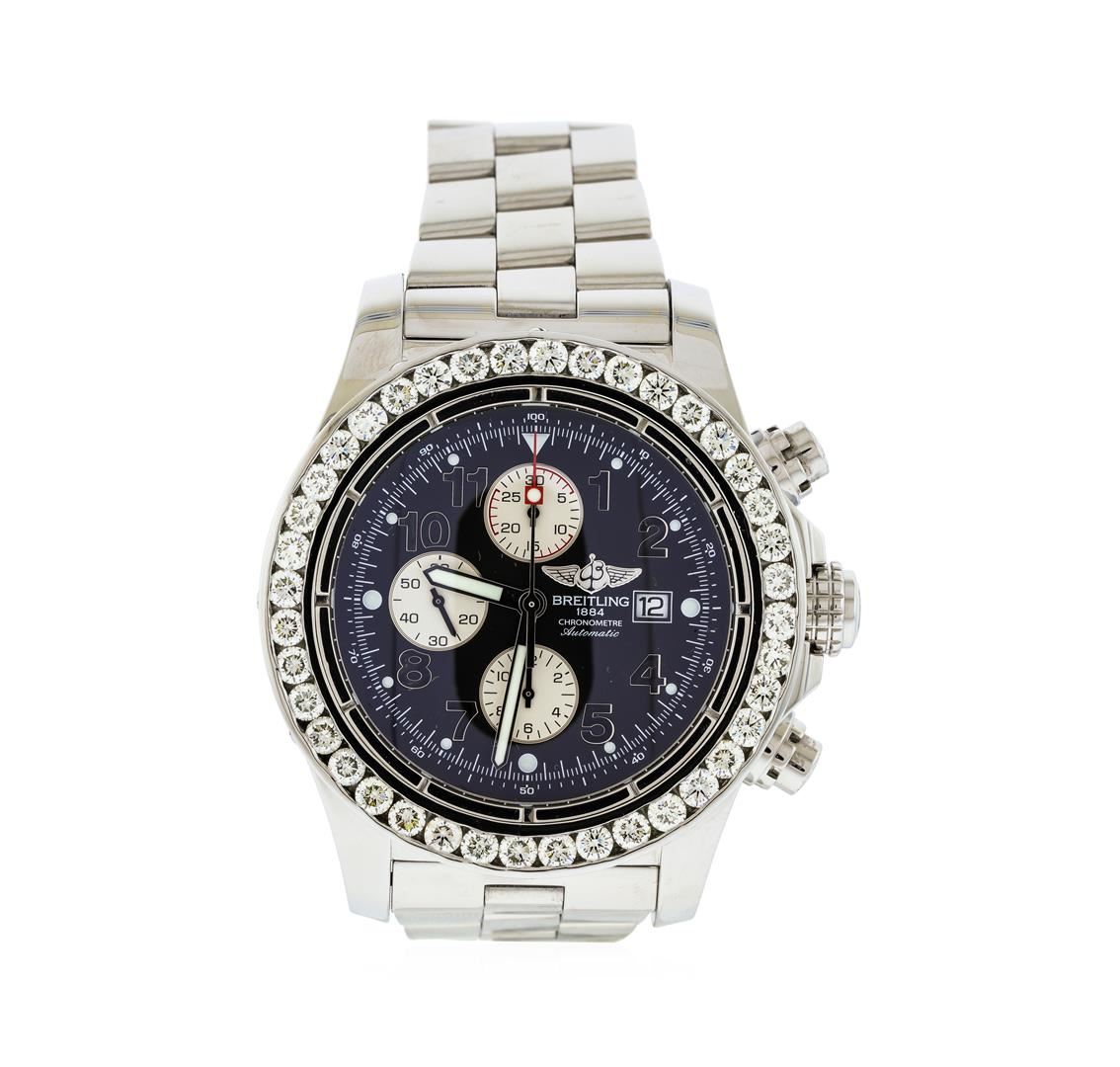 One gents, Breitling Super Avenger wristwatch electronically tested Stainless Steel, Case: 49mm diameter, Case Back: engraved with the manufacturers name and logo in high relief, also engraved with additional information, and ID numbers, Water Resistant: 300 Meters / 1000 Feet. Crown: scalloped; Breitling logo engraved in high relief, set within protective shoulders and the chronograph pushers, Custom Fixed Bezel: diamond set, Crystal: glare resistant synthetic sapphire, Movement: Breitling 13, ETA Valjoux 7750, Swiss Automatic Certifie Chronometre with a 42 hour power reserve. Case Ring: Stopwatch scale, Breitling signed Dial: Black color, with luminous baton pointed hands & indices, Date Window: three o'clock position, Chronograph Functions: three sub dials for; continuous seconds, 30 minutes, & 12 hour totalizers. Breitling Bracelet: Stainless Steel Professional II links; eight and one half inch length, adjustable. Condition: G-6 Extra Fine. Bright polish finish. Containing: Forty burnish set round brilliant cut diamonds, measuring 3.50 - 3.30mm (depth est.) approximate total weight = 6.00ct. Clarity VVS-2 to VS-1 Average Color H - J. Total Weight of Diamonds 6.00ct. Total Weight of Wristwatch 259.22gm. AIG Appraised at $23,000.00.