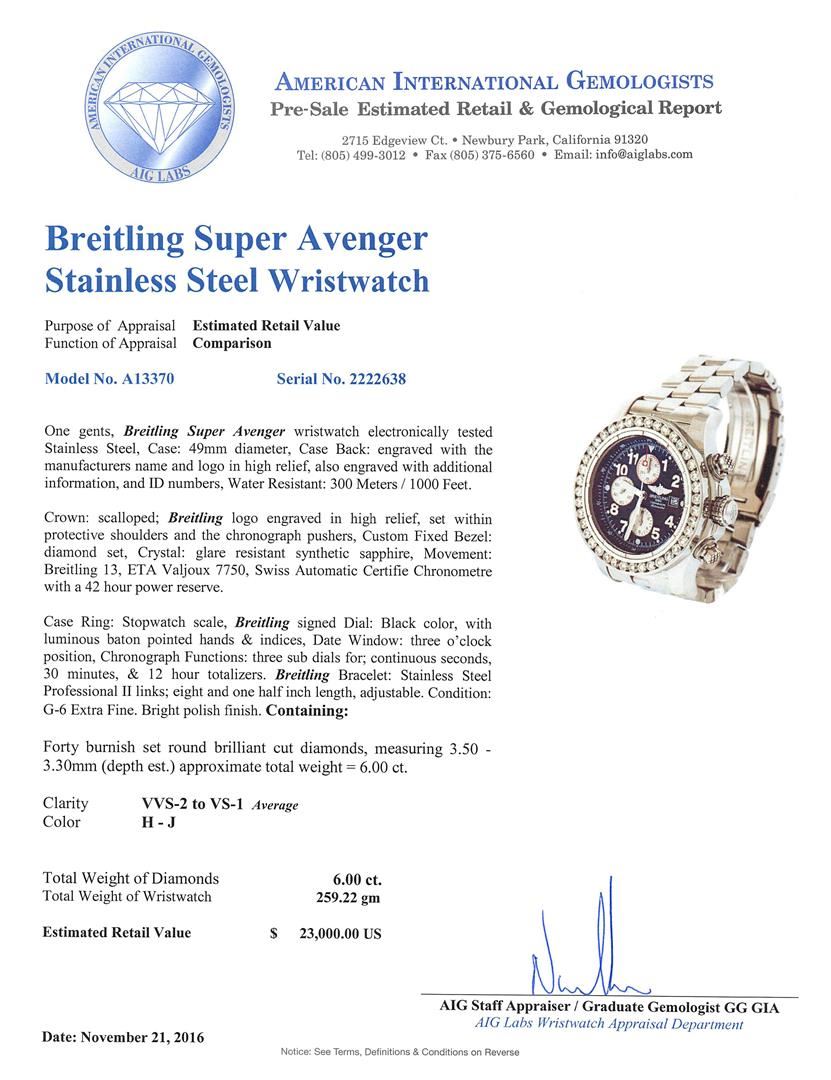 One gents, Breitling Super Avenger wristwatch electronically tested Stainless Steel, Case: 49mm diameter, Case Back: engraved with the manufacturers name and logo in high relief, also engraved with additional information, and ID numbers, Water Resistant: 300 Meters / 1000 Feet. Crown: scalloped; Breitling logo engraved in high relief, set within protective shoulders and the chronograph pushers, Custom Fixed Bezel: diamond set, Crystal: glare resistant synthetic sapphire, Movement: Breitling 13, ETA Valjoux 7750, Swiss Automatic Certifie Chronometre with a 42 hour power reserve. Case Ring: Stopwatch scale, Breitling signed Dial: Black color, with luminous baton pointed hands & indices, Date Window: three o'clock position, Chronograph Functions: three sub dials for; continuous seconds, 30 minutes, & 12 hour totalizers. Breitling Bracelet: Stainless Steel Professional II links; eight and one half inch length, adjustable. Condition: G-6 Extra Fine. Bright polish finish. Containing: Forty burnish set round brilliant cut diamonds, measuring 3.50 - 3.30mm (depth est.) approximate total weight = 6.00ct. Clarity VVS-2 to VS-1 Average Color H - J. Total Weight of Diamonds 6.00ct. Total Weight of Wristwatch 259.22gm. AIG Appraised at $23,000.00.