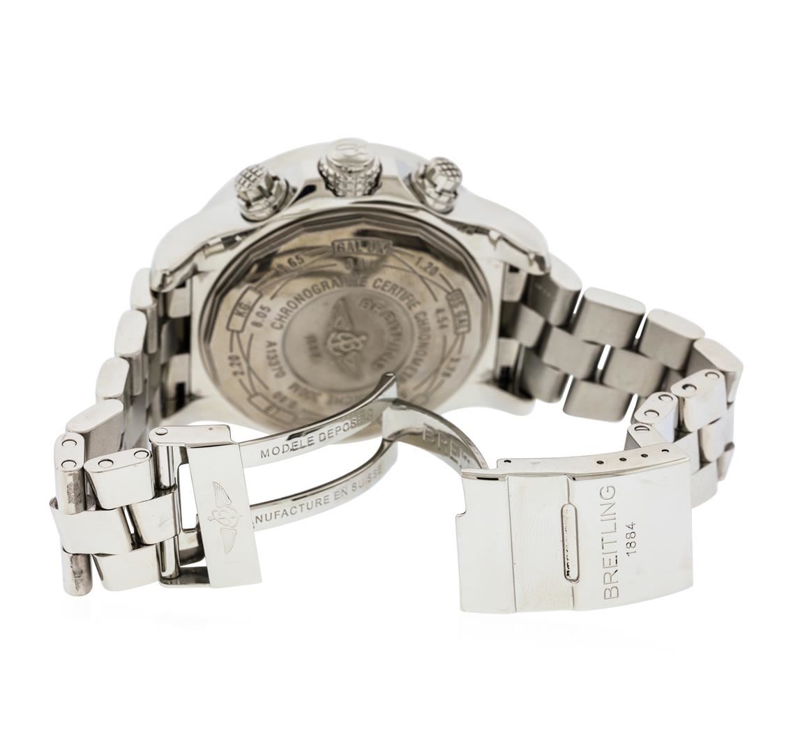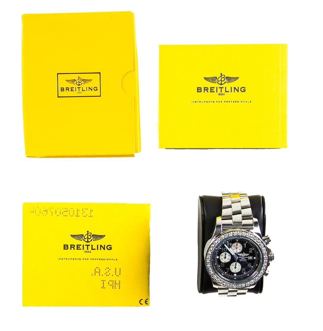 One gents, Breitling Super Avenger wristwatch electronically tested Stainless Steel, Case: 49mm diameter, Case Back: engraved with the manufacturers name and logo in high relief, also engraved with additional information, and ID numbers, Water Resistant: 300 Meters / 1000 Feet. Crown: scalloped; Breitling logo engraved in high relief, set within protective shoulders and the chronograph pushers, Custom Fixed Bezel: diamond set, Crystal: glare resistant synthetic sapphire, Movement: Breitling 13, ETA Valjoux 7750, Swiss Automatic Certifie Chronometre with a 42 hour power reserve. Case Ring: Stopwatch scale, Breitling signed Dial: Black color, with luminous baton pointed hands & indices, Date Window: three o'clock position, Chronograph Functions: three sub dials for; continuous seconds, 30 minutes, & 12 hour totalizers. Breitling Bracelet: Stainless Steel Professional II links; eight and one half inch length, adjustable. Condition: G-6 Extra Fine. Bright polish finish. Containing: Forty burnish set round brilliant cut diamonds, measuring 3.50 - 3.30mm (depth est.) approximate total weight = 6.00ct. Clarity VVS-2 to VS-1 Average Color H - J. Total Weight of Diamonds 6.00ct. Total Weight of Wristwatch 259.22gm. AIG Appraised at $23,000.00.