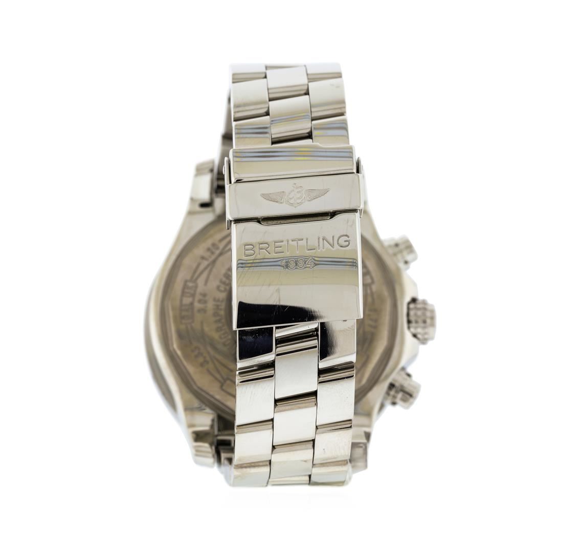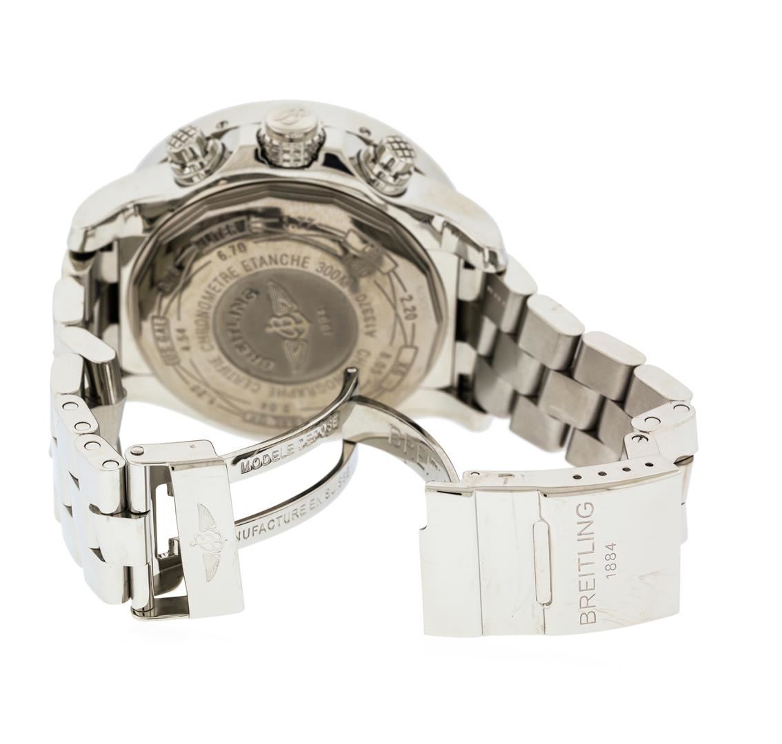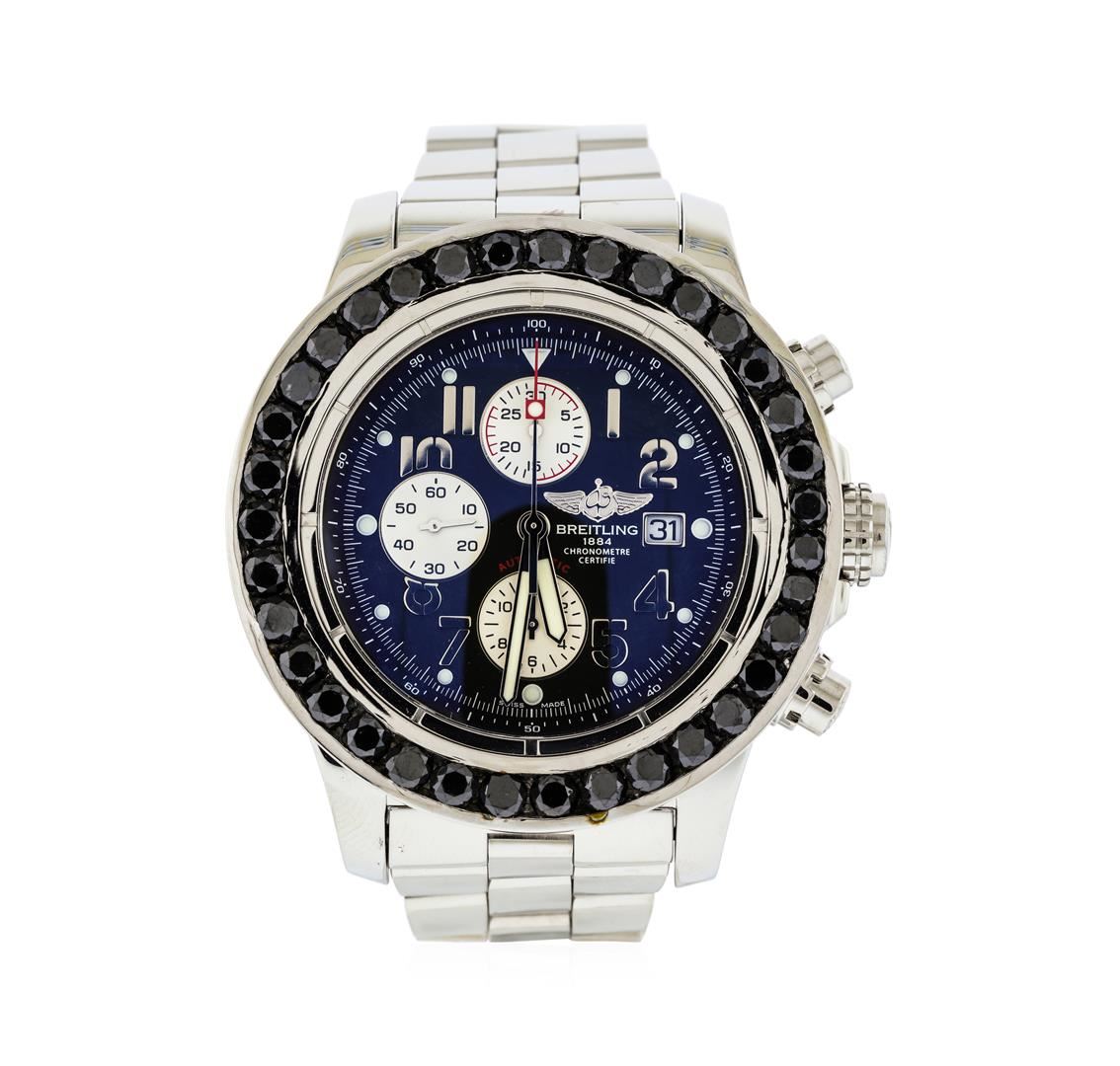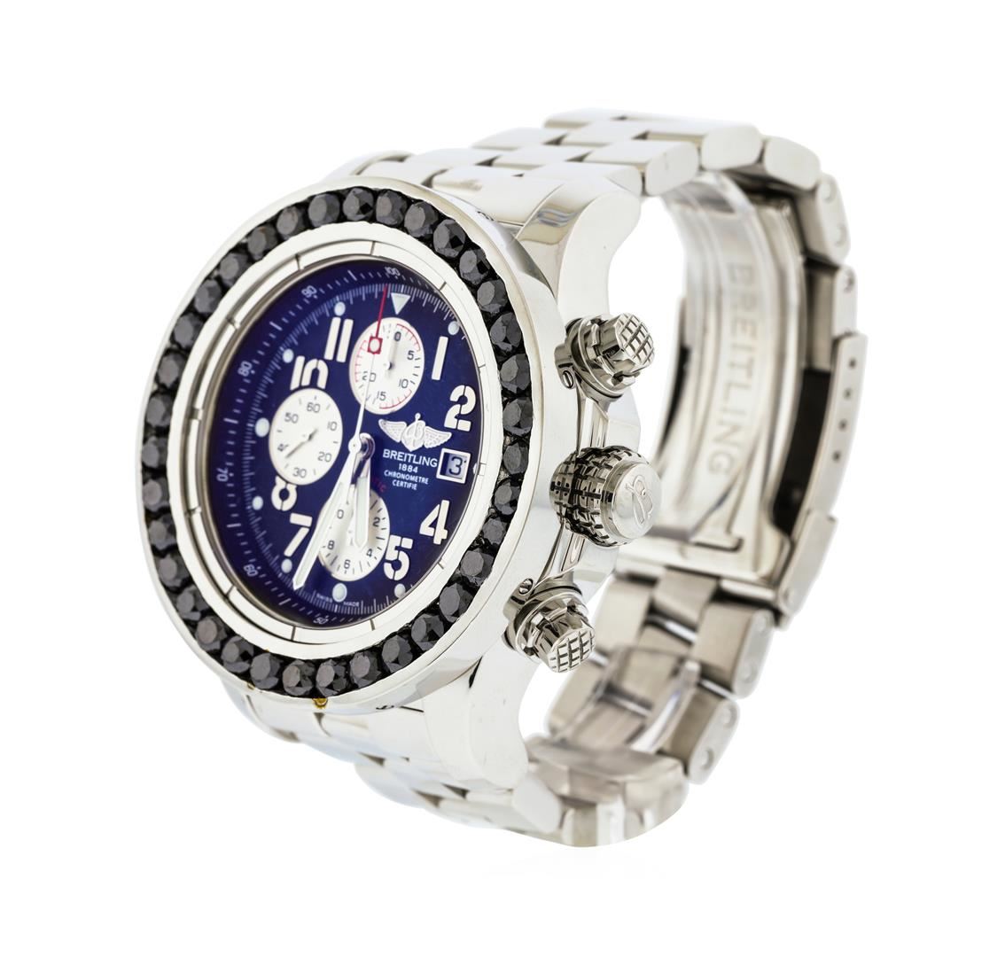 One gents, Breitling Super Avenger wristwatch electronically tested Stainless Steel, Case: 49mm diameter, Case Back: engraved with the manufacturers name and logo in high relief, also engraved with additional information, and ID numbers, Water Resistant: 300 Meters / 1000 Feet. Crown: scalloped; Breitling logo engraved in high relief, set within protective shoulders and the chronograph pushers, Custom Fixed Bezel: diamond set, Crystal: glare resistant synthetic sapphire, Movement: Breitling 13, ETA Valjoux 7750, Swiss Automatic Certifie Chronometre with a 42 hour power reserve. Case Ring: Stopwatch scale, Breitling signed Dial: Black color, with luminous baton pointed hands & indices, Date Window: three o'clock position, Chronograph Functions: three sub dials for; continuous seconds, 30 minutes, & 12 hour totalizers. Breitling Bracelet: Stainless Steel Professional II links; eight inch length, adjustable. Condition: G-6 Extra Fine. Bright polish finish. Containing: Thirty Five channel set round brilliant cut diamonds, measuring 4.20 - 4.00mm (depth est.) approximate total weight = 9.00ct. Indications of multiples enhancements. Graded in the setting. Clarity Declasse Color Black. Total Weight of Diamonds 9.00ct. Total Weight of Wristwatch 266.38gm. AIG Appraised at $13,000.00.