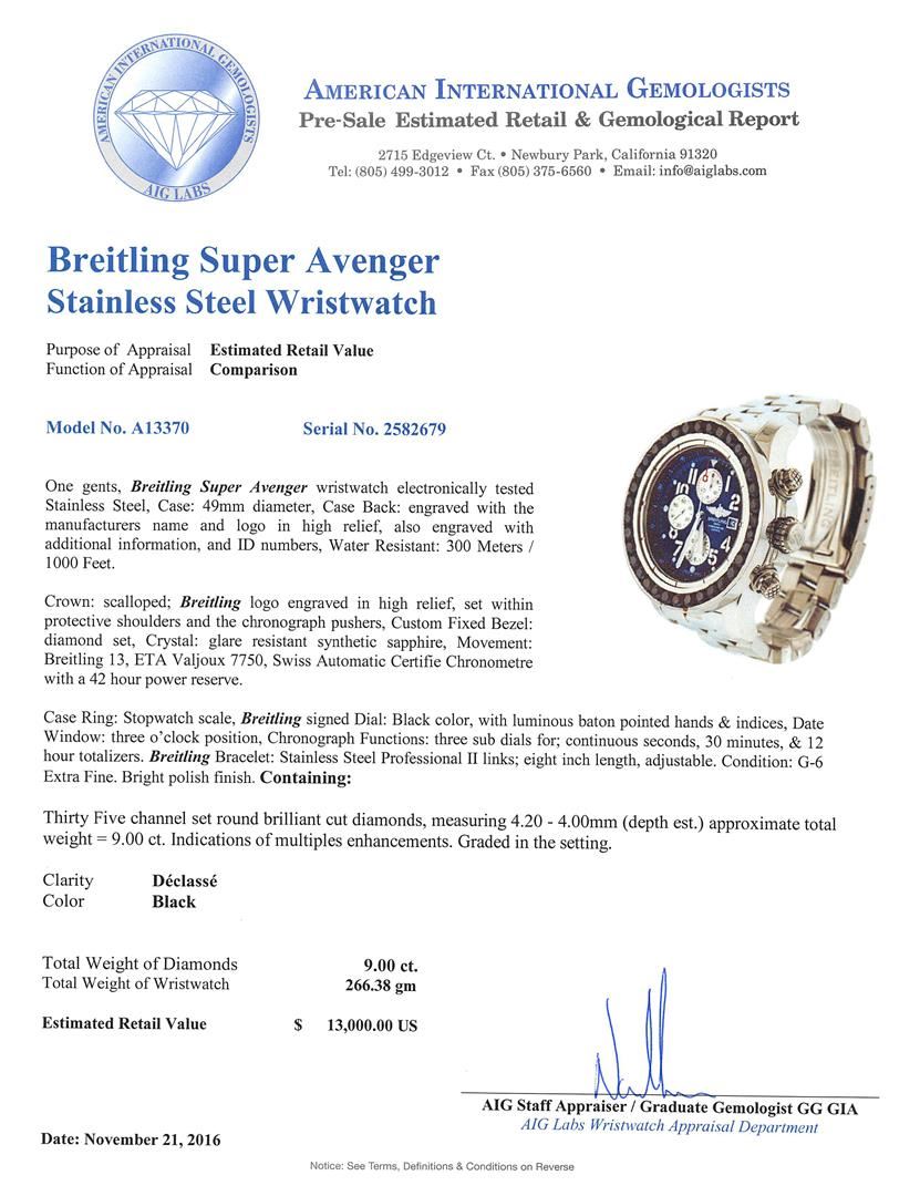 One gents, Breitling Super Avenger wristwatch electronically tested Stainless Steel, Case: 49mm diameter, Case Back: engraved with the manufacturers name and logo in high relief, also engraved with additional information, and ID numbers, Water Resistant: 300 Meters / 1000 Feet. Crown: scalloped; Breitling logo engraved in high relief, set within protective shoulders and the chronograph pushers, Custom Fixed Bezel: diamond set, Crystal: glare resistant synthetic sapphire, Movement: Breitling 13, ETA Valjoux 7750, Swiss Automatic Certifie Chronometre with a 42 hour power reserve. Case Ring: Stopwatch scale, Breitling signed Dial: Black color, with luminous baton pointed hands & indices, Date Window: three o'clock position, Chronograph Functions: three sub dials for; continuous seconds, 30 minutes, & 12 hour totalizers. Breitling Bracelet: Stainless Steel Professional II links; eight inch length, adjustable. Condition: G-6 Extra Fine. Bright polish finish. Containing: Thirty Five channel set round brilliant cut diamonds, measuring 4.20 - 4.00mm (depth est.) approximate total weight = 9.00ct. Indications of multiples enhancements. Graded in the setting. Clarity Declasse Color Black. Total Weight of Diamonds 9.00ct. Total Weight of Wristwatch 266.38gm. AIG Appraised at $13,000.00.