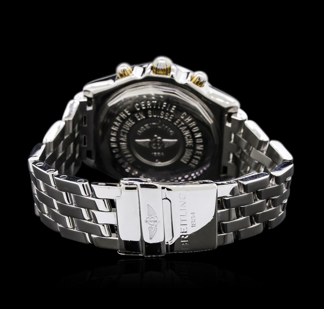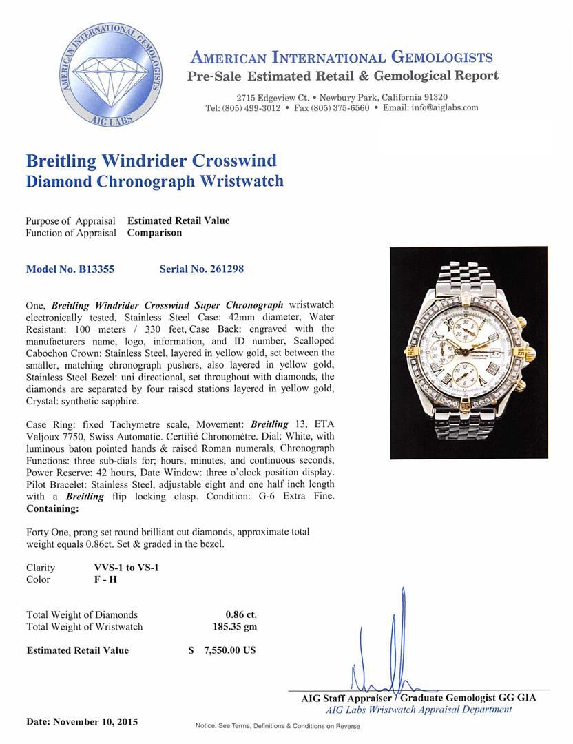 One, Breitling Windrider Crosswind Super Chronograph wristwatch electronically tested, Stainless Steel Case: 42mm diameter, Water Resistant: 100 meters / 330 feet, Case Back: engraved with the manufacturers name, logo, information, and ID number, Scalloped Cabochon Crown: Stainless Steel, layered in yellow gold, set between the smaller, matching chronograph pushers, also layered in yellow gold, Stainless Steel Bezel: uni directional, set throughout with diamonds, the diamonds are separated by four raised stations layered in yellow gold, Crystal: synthetic sapphire. Case Ring: fixed Tachymetre scale, Movement: Breitling 13, ETA Valjoux 7750, Swiss Automatic. Certifi, ChronomStre. Dial: White, with luminous baton pointed hands & raised Roman numerals, Chronograph Functions: three sub-dials for; hours, minutes, and continuous seconds, Power Reserve: 42 hours, Date Window: three o'clock position display. Pilot Bracelet: Stainless Steel, adjustable eight and one half inch length with a Breitling flip locking clasp. Condition: G-6 Extra Fine. Containing: Forty One, prong set round brilliant cut diamonds, approximate total weight equals 0.86ct. Set & graded in the bezel. Clarity: VVS-1 to VS-1. Color: F - H. Total Weight of Diamonds 0.86ct. Total Weight of Wristwatch 185.35gm. AIG Appraised at $7,550.00.