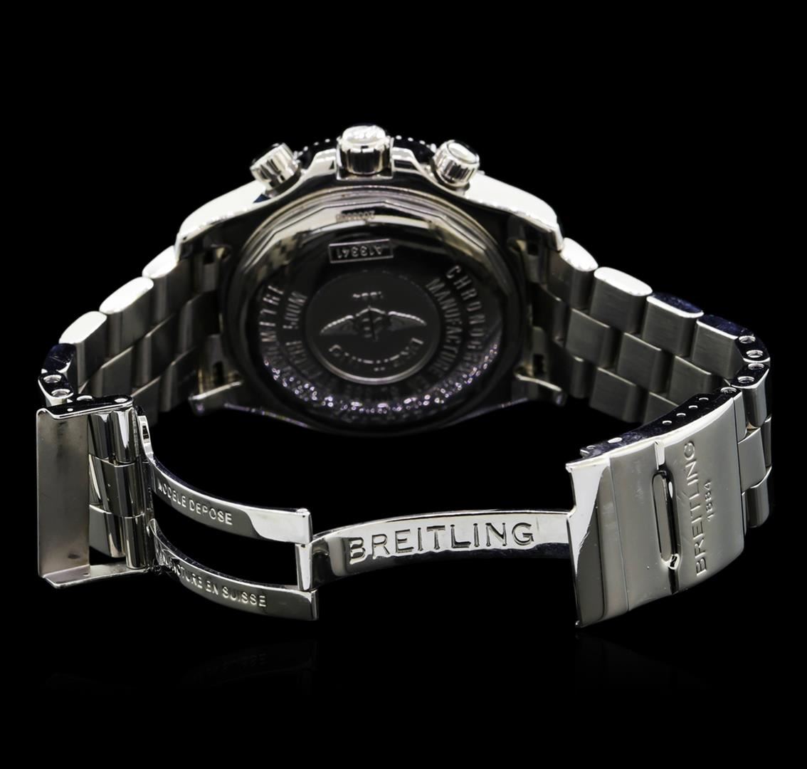 One Breitling SuperOcean Heritage men's watch featuring: Case: Stainless steel. Bezel: Stainless steel, rotating. Dial: Black color; silver-tone luminescent hands; silver tone luminescent index hour markers. Features: Chronograph; date window located at the 3 o'clock position. Bracelet: Stainless steel. Condition: Minor surface scratches can be seen up close, but otherwise the watch is in great condition.