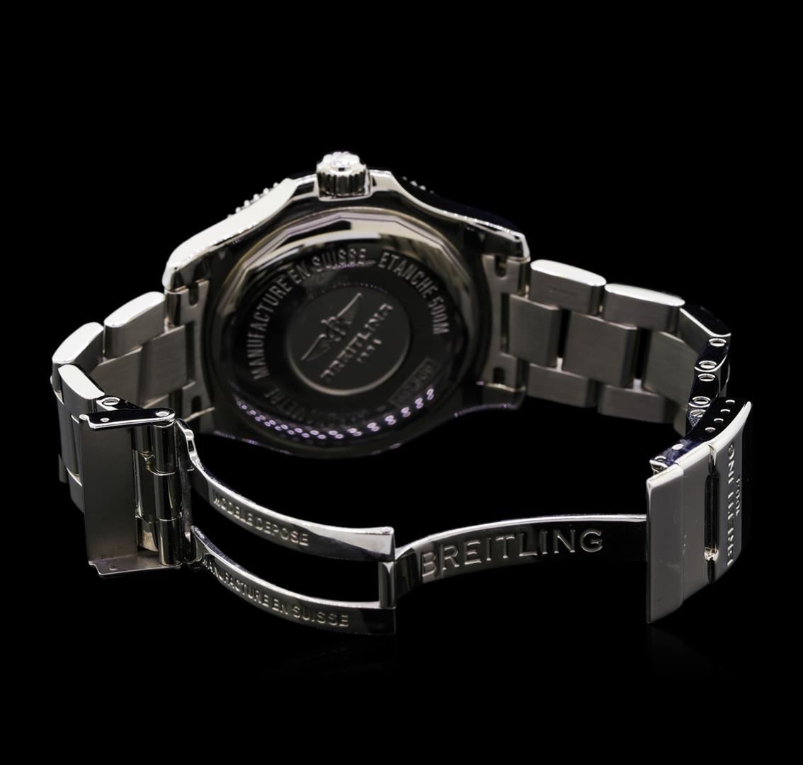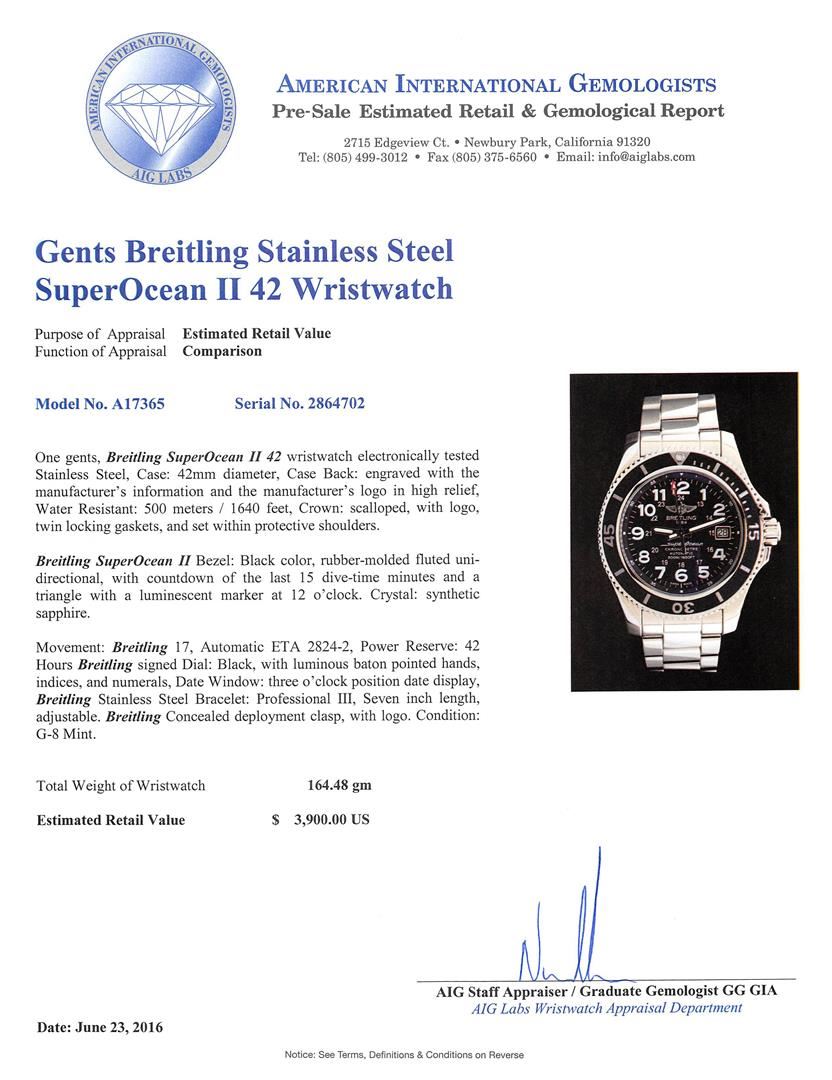 One gents, Breitling SuperOcean II 42 wristwatch electronically tested Stainless Steel, Case: 42mm diameter, Case Back: engraved with the manufacturer's information and the manufacturer's logo in high relief, Water Resistant: 500 meters / 1640 feet, Crown: scalloped, with logo, twin locking gaskets, and set within protective shoulders. Breitling SuperOcean II Bezel: Black color, rubber-molded fluted uni-directional, with countdown of the last 15 dive-time minutes and a triangle with a luminescent marker at 12 o'clock. Crystal: synthetic sapphire. Movement: Breitling 17, Automatic ETA 2824-2, Power Reserve: 42 Hours Breitling signed Dial: Black, with luminous baton pointed hands, indices, and numerals, Date Window: three o'clock position date display, Breitling Stainless Steel Bracelet: Professional III, Seven inch length, adjustable. Breitling Concealed deployment clasp, with logo. Condition: G-8 Mint.. Total Weight of Wristwatch 164.48gm. AIG Appraised at $3,900.00.