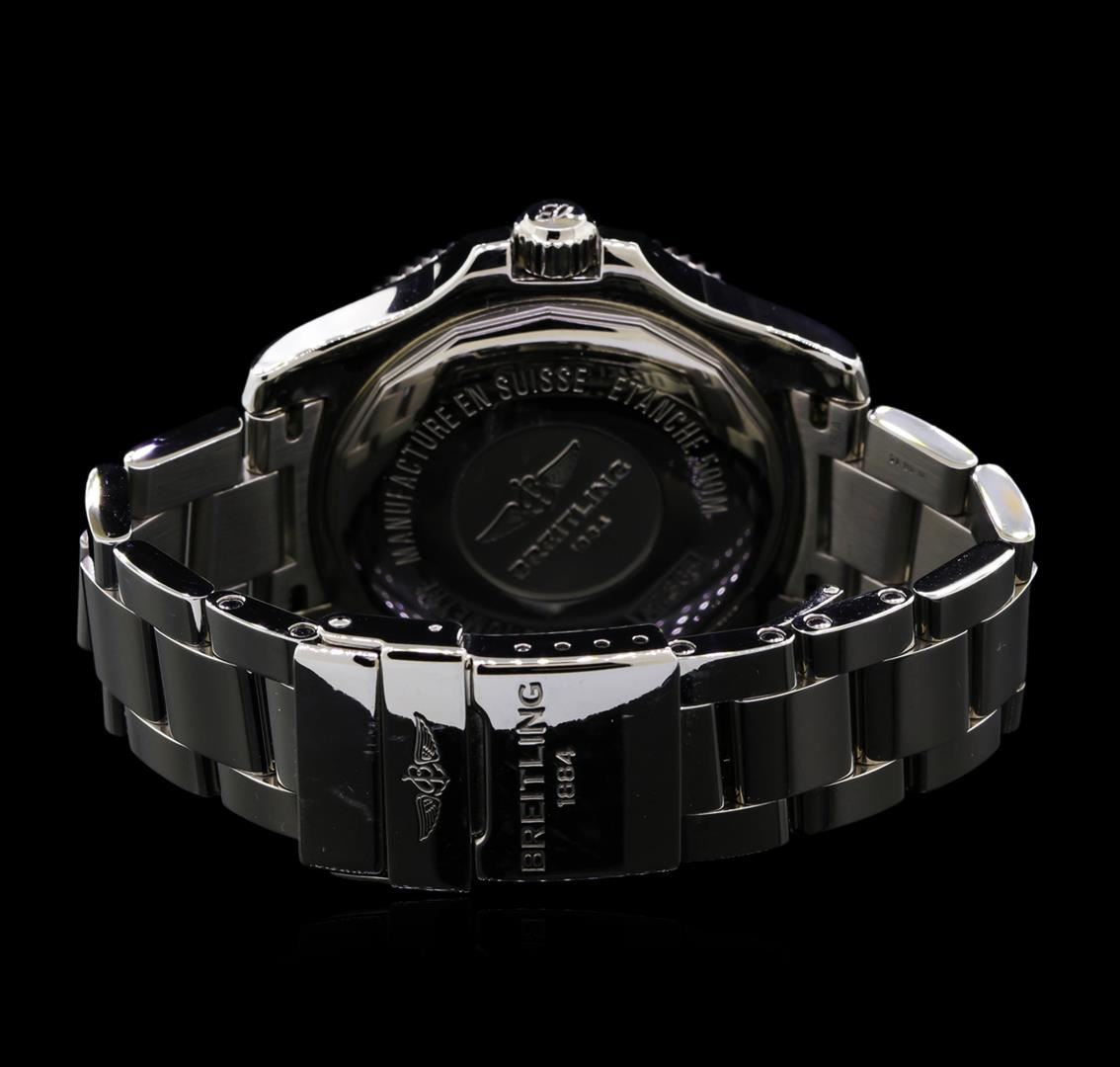 One gents, Breitling SuperOcean II 42 wristwatch electronically tested Stainless Steel, Case: 42mm diameter, Case Back: engraved with the manufacturer's information and the manufacturer's logo in high relief, Water Resistant: 500 meters / 1640 feet, Crown: scalloped, with logo, twin locking gaskets, and set within protective shoulders. Breitling SuperOcean II Bezel: Black color, rubber-molded fluted uni-directional, with countdown of the last 15 dive-time minutes and a triangle with a luminescent marker at 12 o'clock. Crystal: synthetic sapphire. Movement: Breitling 17, Automatic ETA 2824-2, Power Reserve: 42 Hours Breitling signed Dial: Black, with luminous baton pointed hands, indices, and numerals, Date Window: three o'clock position date display, Breitling Stainless Steel Bracelet: Professional III, Seven inch length, adjustable. Breitling Concealed deployment clasp, with logo. Condition: G-8 Mint.. Total Weight of Wristwatch 164.48gm. AIG Appraised at $3,900.00.