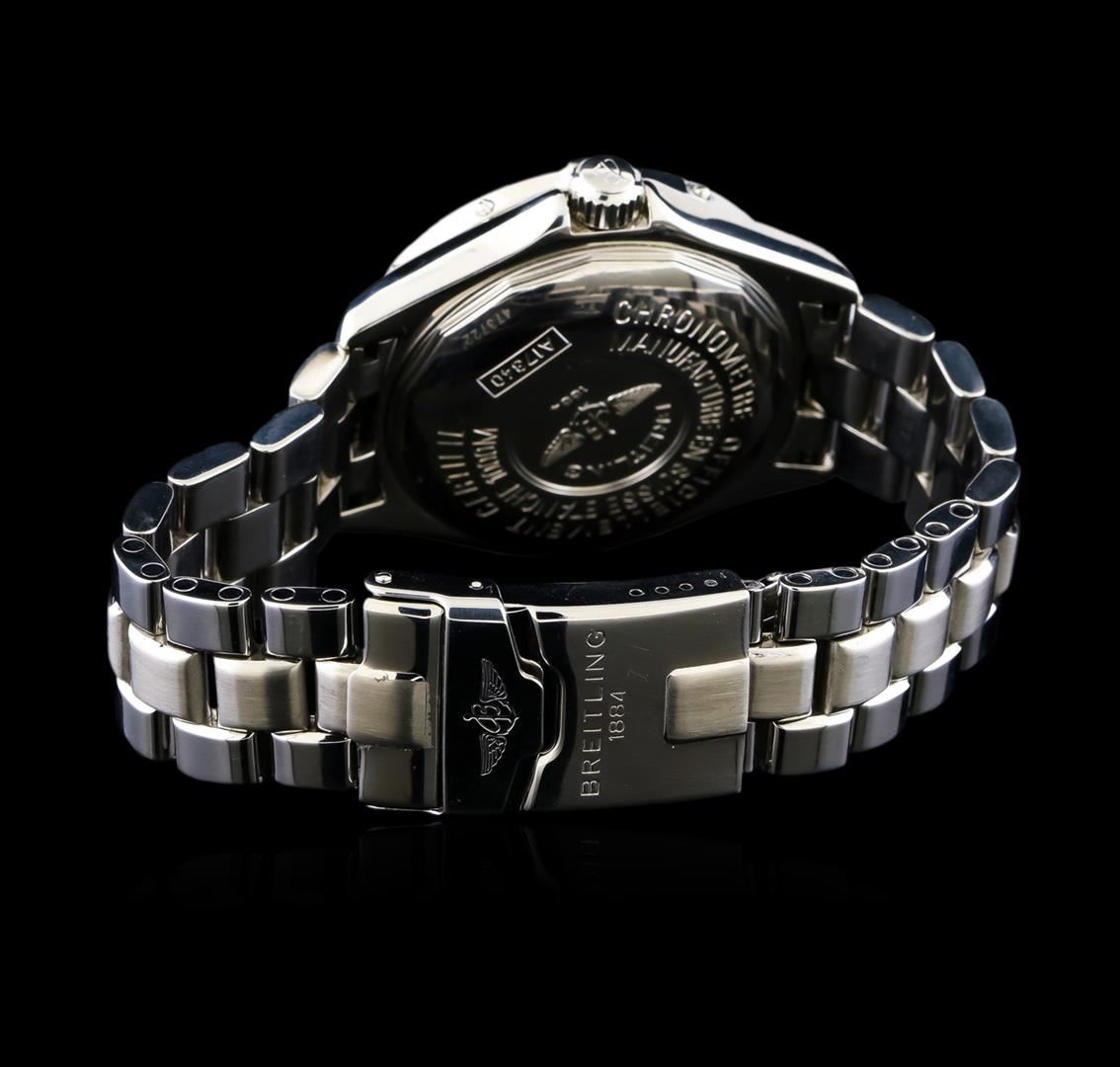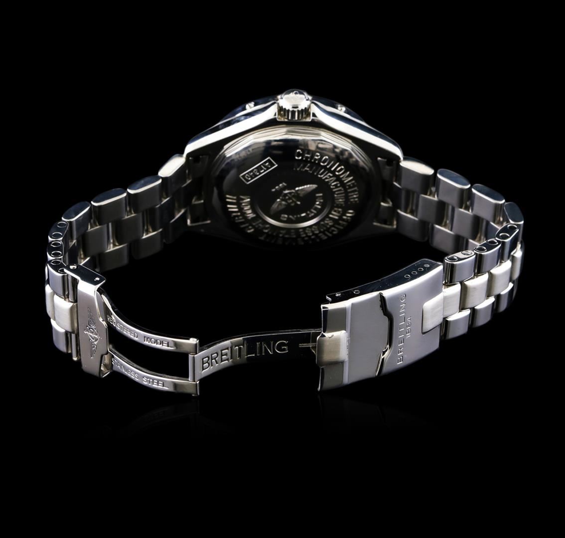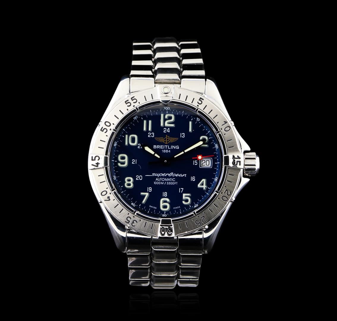 One Breitling SuperOcean watch featuring: Case: Stainless steel. Bezel: Stainless steel, rotating. Dial: Blue color; white/silver tone hands; white/silver tone hour numerals. Features: Date window located at the 3 o'clock position. Bracelet: Stainless steel.