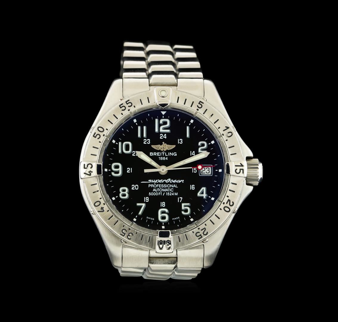 One gents, Breitling Superocean wristwatch electronically tested Stainless Steel, Case: 41mm diameter, with a helium release valve at the 10 o'clock position, Case Back: engraved with the manufacturers information and the manufacturers logo in high relief, Water Resistant: 100 meters / 330 feet, Crown: scalloped, with logo, locking, and set within protective shoulders, Bezel: uni-directional with four raised stations, separated by engraved indices and numerals, Crystal: glare resistant synthetic sapphire. Helium Release Valve: A small valve integrated in the watch case that is activated when the differential between the inner and the outside pressure reaches a critical level. As a result; the valve releases the helium, hydrogen and or other gases used in the breathing gas mix trapped inside the watch case. Movement: Breitling Automatic ETA 2824-2, Power Reserve: 42 Hours Dial: Black, with luminous baton pointed hands, indices, and numerals, Date Window: three o'clock position date display, Bracelet: stainless steel Professional, Seven and one quarter inch length, adjustable. Condition: G-5 Fine. Total Weight of Wristwatch 165.98gm. AIG Appraised at $3,770.00.