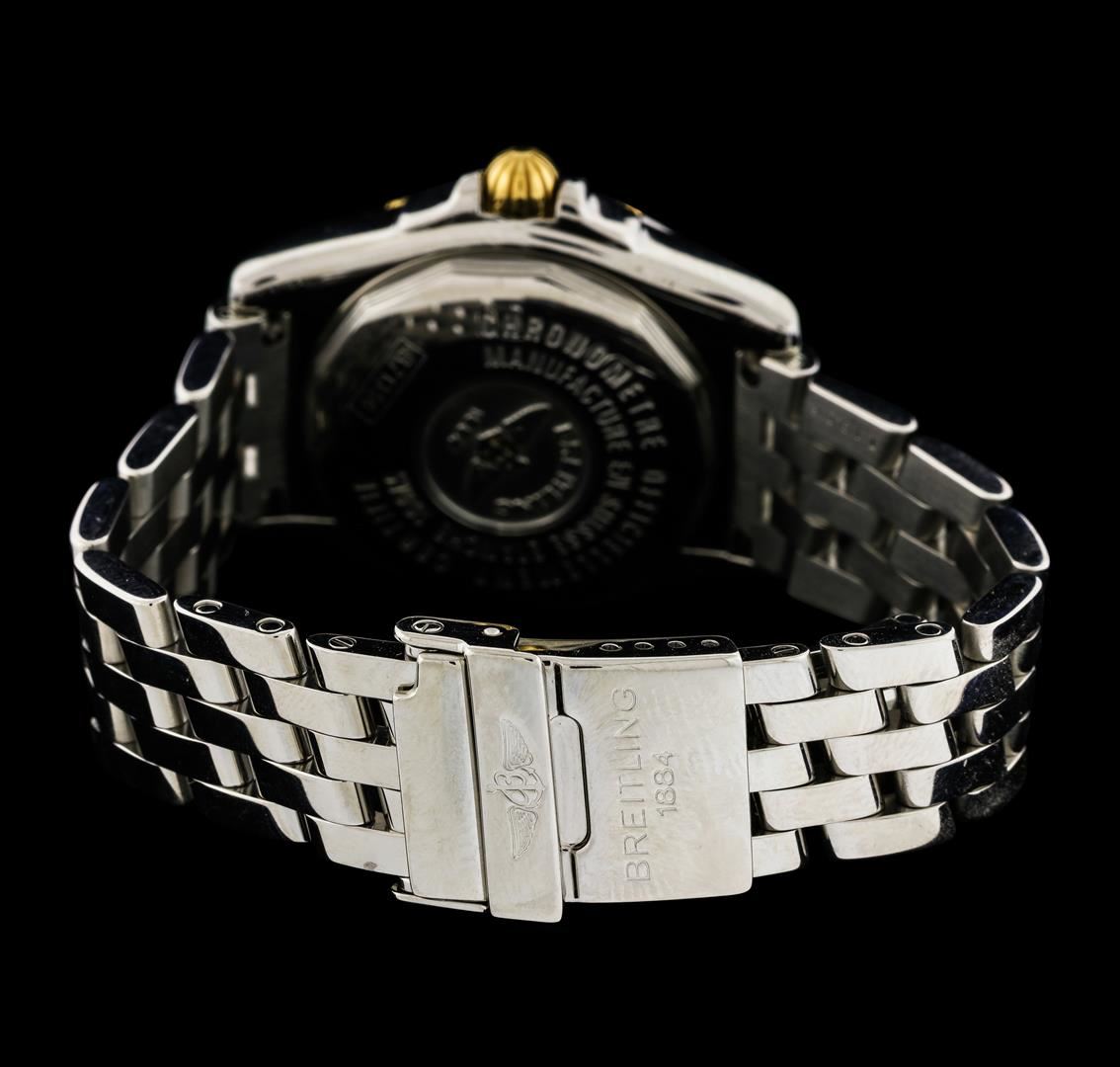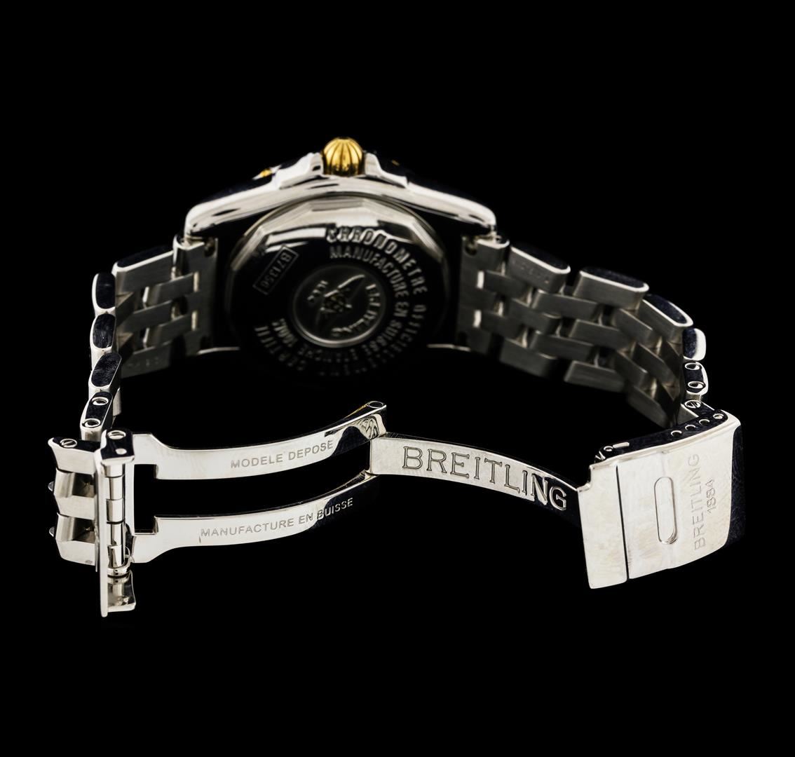 One, Breitling Windrider Lady Cockpit wristwatch electronically tested. Stainless Steel. Case: 32mm diameter, Water Resistant: 100 meters / 330 feet, Case Back: engraved with the manufacturers name, logo, information, and ID numbers, 18KT yellow gold Crown: scalloped, set within protective shoulders, Bezel: uni-directional, engraved with indices and set with four 18KT Yellow gold raised stations, Domed Crystal: synthetic sapphire. Movement: Breitling 71, Superquartz, Breitling signed Dial: Bronze color, with luminous baton pointed hands, raised indices, eight diamond markers, and three Roman numerals, Date Window: 3 o'clock position, Breitling Pilot Bracelet: Stainless Steel links, adjustable six inch length, Swiss hallmarked Breitling concealed flip lock clasp, with logo. Two removable links. Condition: G-7 Near Mint. Bright polish finish. Total Weight of Wristwatch 82.01gm. AIG Appraised at $3,550.00.