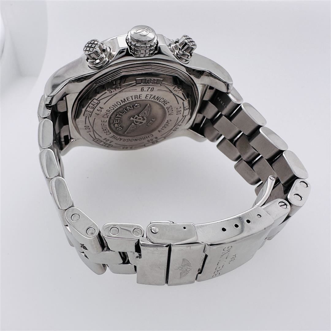 One Breitling Super Avenger Stainless Steel Chronograph Black Dial Wristwatch. This watch is in excellent condition. The watch photographed is the actual watch.