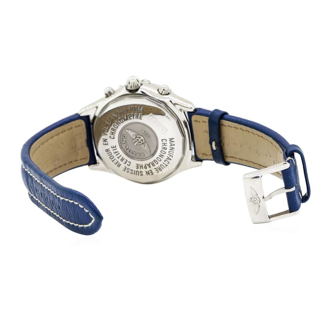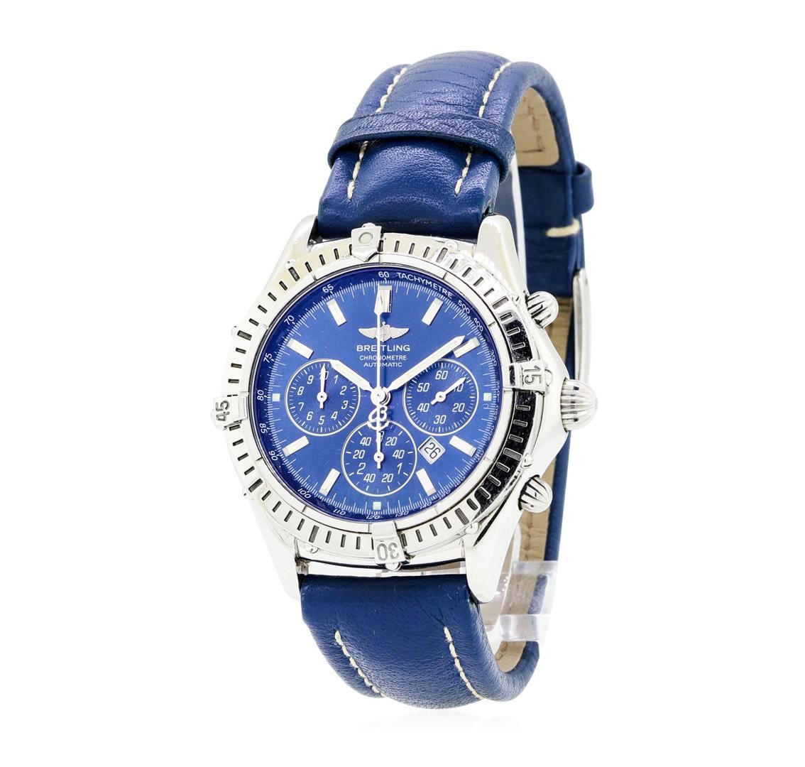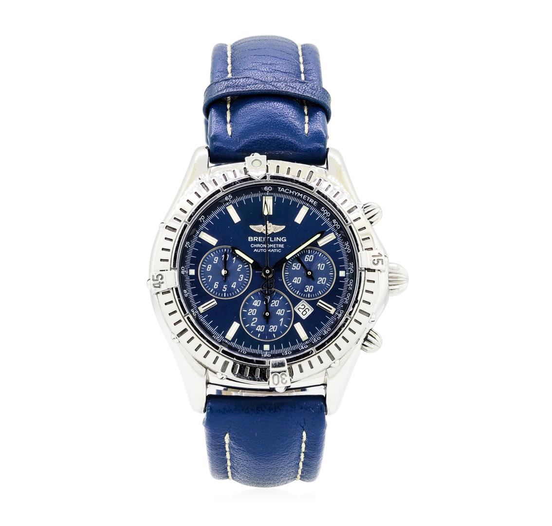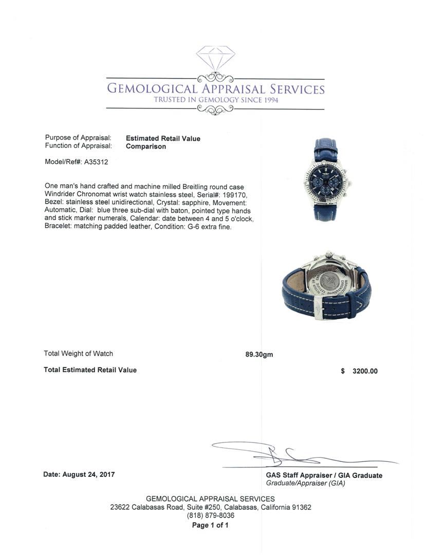 One man's, hand crafted and machine milled Breitling round case Windrider Chronomat wrist watch stainless steel, Serial#: 199170, Bezel: stainless steel unidirectional, Crystal: sapphire, Movement: Automatic, Dial: blue three sub-dial with baton, pointed type hands and stick marker numerals, Calendar: date between 4 and 5 o'clock, Bracelet: matching padded leather, Condition: G-6 extra fine.. Total Weight of Watch 89.30gm GAS Appraised at $3200.00. GAS Appraised at $3,200.00.
