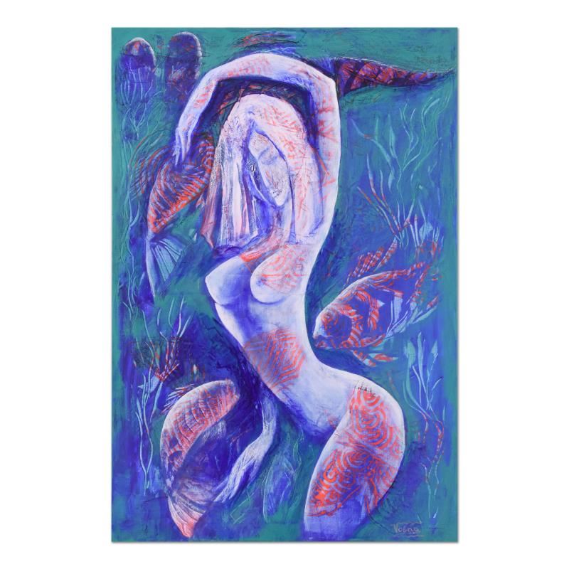 "Bright Eternity" is an original acrylic painting on stretched canvas by Nadia Volna, hand signed by the artist. This piece is painted with light-reactive black light paint that reveals brilliant colors when viewed under incandescent light. This piece comes with a blacklight flashlight (batteries not included). Includes Letter of Authenticity. Measures approx. 24" x 36" (image).