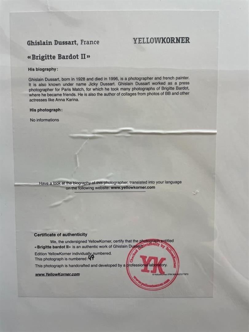 Brigitte Bardot III Ghislain Dussart Actress YellowKorner Certified Photograph. Certificate of Authenticity from YellowKorner affixed to the back. Matted Dimensions 16"x20". Protected with Clear Mylar Sleeve.