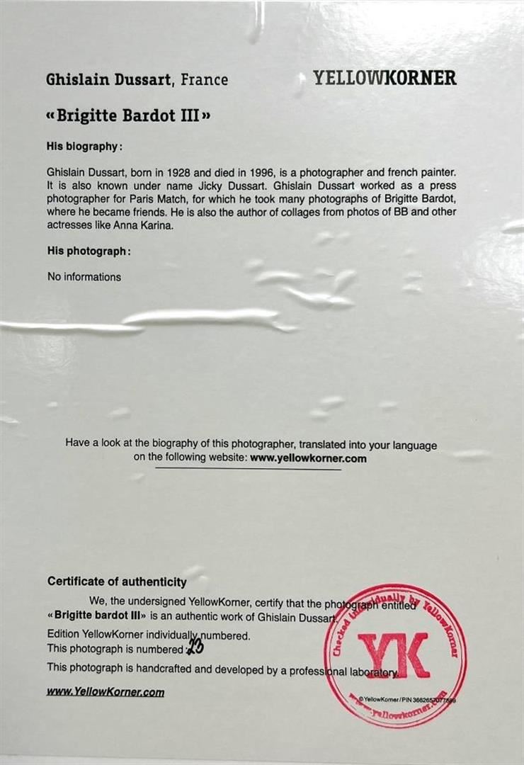Brigitte Bardot IIIGhislain Dussart France YellowKorner Certified Photograph. Certificate of Authenticity from YellowKorner affixed to the back. Matted Dimensions 16"x20". Protected with Clear Mylar Sleeve.