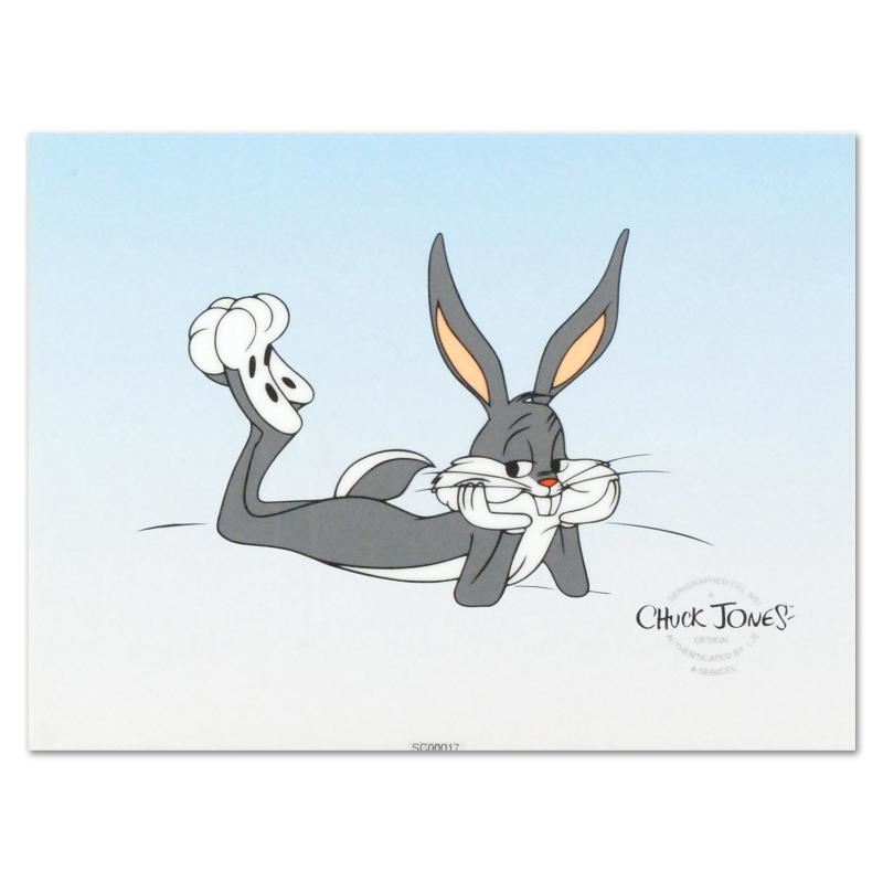 Familiar characters, vibrant colors, and careful details make this sericel one for both serious collectors and casual fans. "Bugs Bunny Lying Down" is a limited edition sericel by Chuck Jones (1912-2002) depicting the cartoon favorite, Bugs Bunny. Includes Certificate of Authenticity! Measures approx. 8" x 6" (with background).