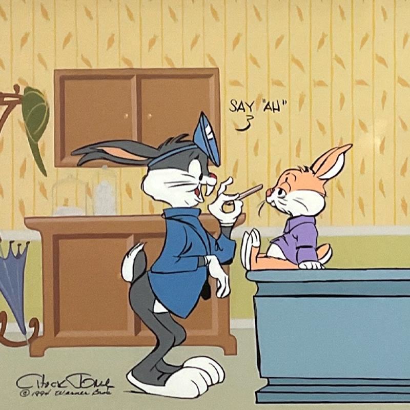 "Bugs Doctor: Say Ah!" is a limited edition sericel diptych with hand painted color on sericel outline, dated (1994), numbered and hand signed by Chuck Jones (1912-2002). This piece comes custom framed. This piece bears the official seal of Linda Jones Enterprises and includes Certificate of Authenticity. Measures approx. 30" x 15" (frame); 10" x 25" (image). This item requires special handling and may have a longer than usual turnaround.