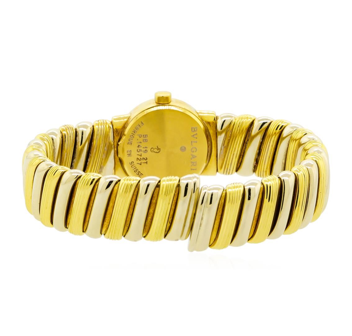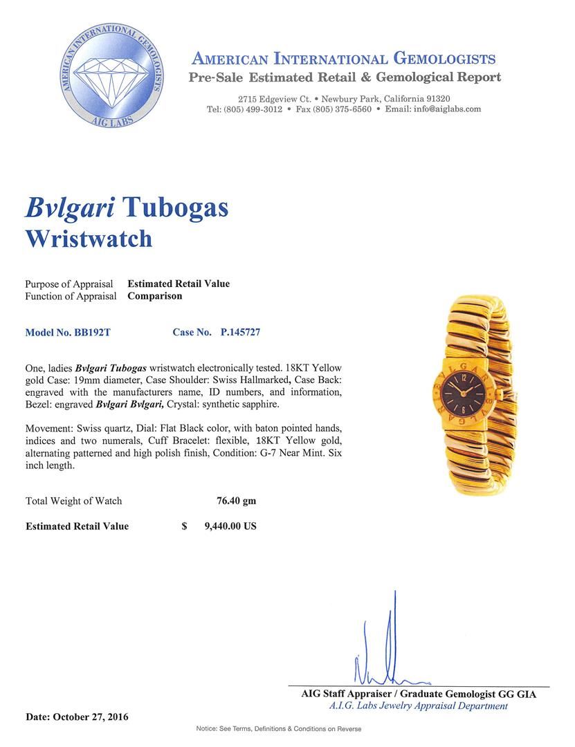 One, ladies Bvlgari Tubogas wristwatch electronically tested. 18KT Yellow gold Case: 19mm diameter, Case Shoulder: Swiss Hallmarked, Case Back: engraved with the manufacturers name, ID numbers, and information, Bezel: engraved Bvlgari Bvlgari, Crystal: synthetic sapphire. Movement: Swiss quartz, Dial: Flat Black color, with baton pointed hands, indices and two numerals, Cuff Bracelet: flexible, 18KT Yellow gold, alternating patterned and high polish finish, Condition: G-7 Near Mint. Six inch length. Total Weight of Watch 76.40gm. AIG Appraised at $9,440.00.