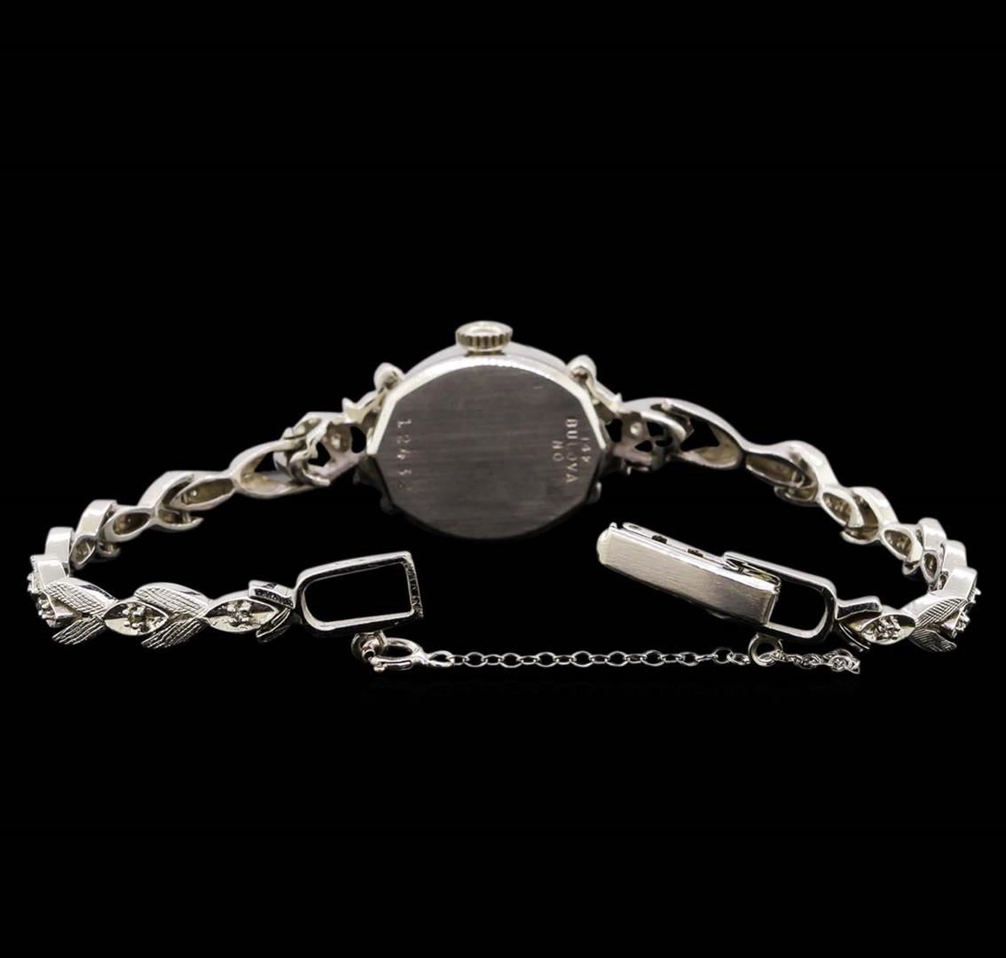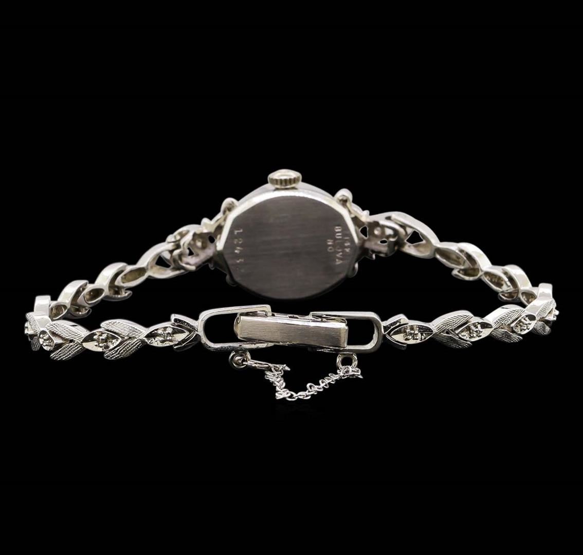 One ladies, vintage Bulova diamond wristwatch electronically tested, 14KT white gold Case: 17 x 13mm, Scalloped Crown: dial & movement set, Bezel: diamond set, Crystal: domed acrylic. Case No. 12432.USA Movement: twenty three jewel mechanical, Dial: Silvered, with baton pointed type hands, numerals & indices, 14KT white gold Bracelet: diamond set links, Condition: G-4 Average. Bright polish finish, Six inch length. Over locking clasp. Containing: Twenty Four bright cut & bead set single cut diamonds, approximate. Total Weight of 24 Stones = 0.15ct. Graded in the setting. Clarity: VS-1 to VS-2. Color: G - I. Total Weight of Diamonds 0.15ct. Total Weight of Watch 14.68 grams. AIG Appraised at $3,880.00.