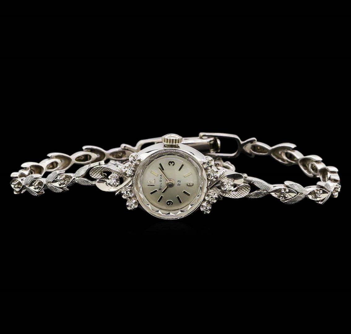 One ladies, vintage Bulova diamond wristwatch electronically tested, 14KT white gold Case: 17 x 13mm, Scalloped Crown: dial & movement set, Bezel: diamond set, Crystal: domed acrylic. Case No. 12432.USA Movement: twenty three jewel mechanical, Dial: Silvered, with baton pointed type hands, numerals & indices, 14KT white gold Bracelet: diamond set links, Condition: G-4 Average. Bright polish finish, Six inch length. Over locking clasp. Containing: Twenty Four bright cut & bead set single cut diamonds, approximate. Total Weight of 24 Stones = 0.15ct. Graded in the setting. Clarity: VS-1 to VS-2. Color: G - I. Total Weight of Diamonds 0.15ct. Total Weight of Watch 14.68 grams. AIG Appraised at $3,880.00.