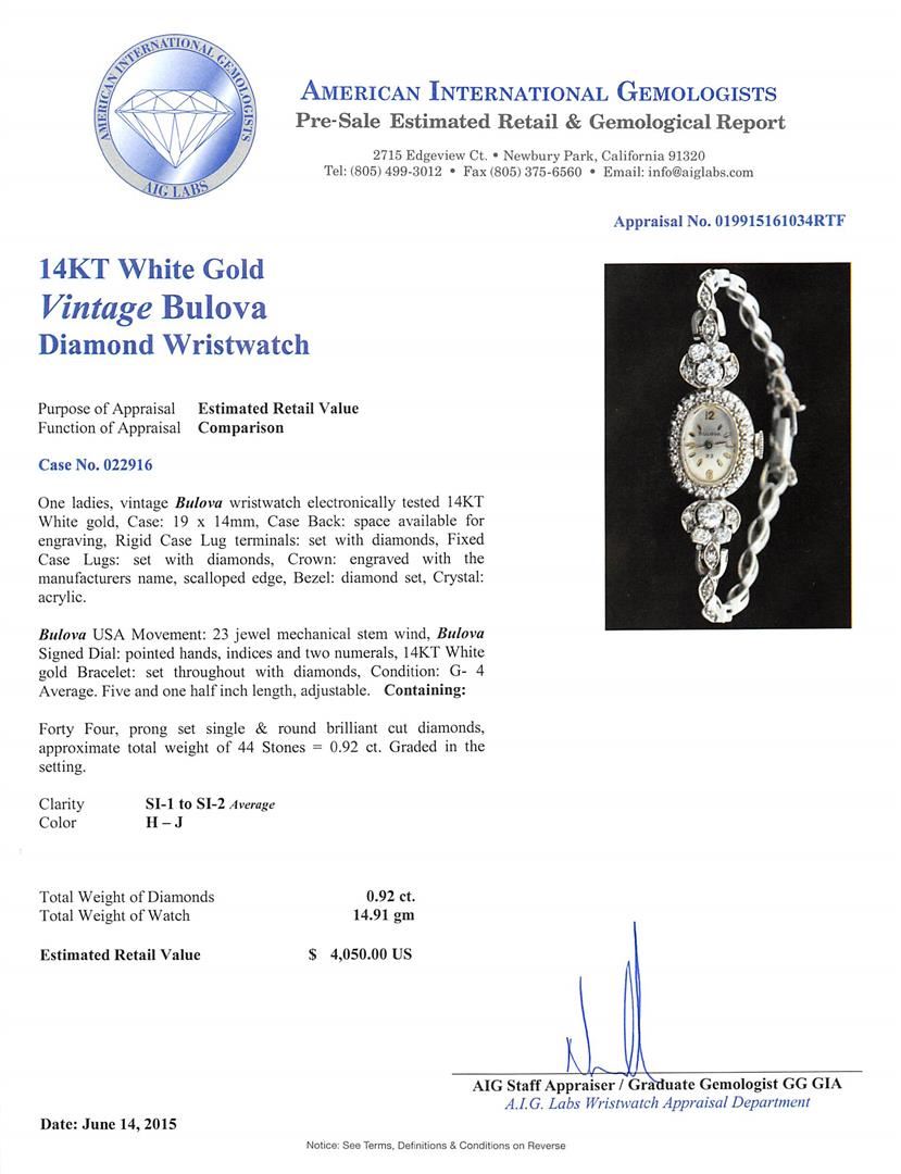 One ladies, vintage Bulova wristwatch electronically tested 14KT White gold, Case: 19 x 14mm, Case Back: space available for engraving, Rigid Case Lug terminals: set with diamonds, Fixed Case Lugs: set with diamonds, Crown: engraved with the manufacturers name, scalloped edge, Bezel: diamond set, Crystal: acrylic. Bulova USA Movement: 23 jewel mechanical stem wind, Bulova Signed Dial: pointed hands, indices and two numerals, 14KT White gold Bracelet: set throughout with diamonds, Condition: G- 4 Average. Five and one half inch length, adjustable. Containing: Forty Four, prong set single & round brilliant cut diamonds, approximate total weight of 44 Stones = 0.92ct. Graded in the setting. Clarity: SI-1 to SI-2 Average. Color: H - J. Total Weight of Diamonds 0.92ct. Total Weight of Watch 14.91 grams. AIG Appraised at $4,050.00.